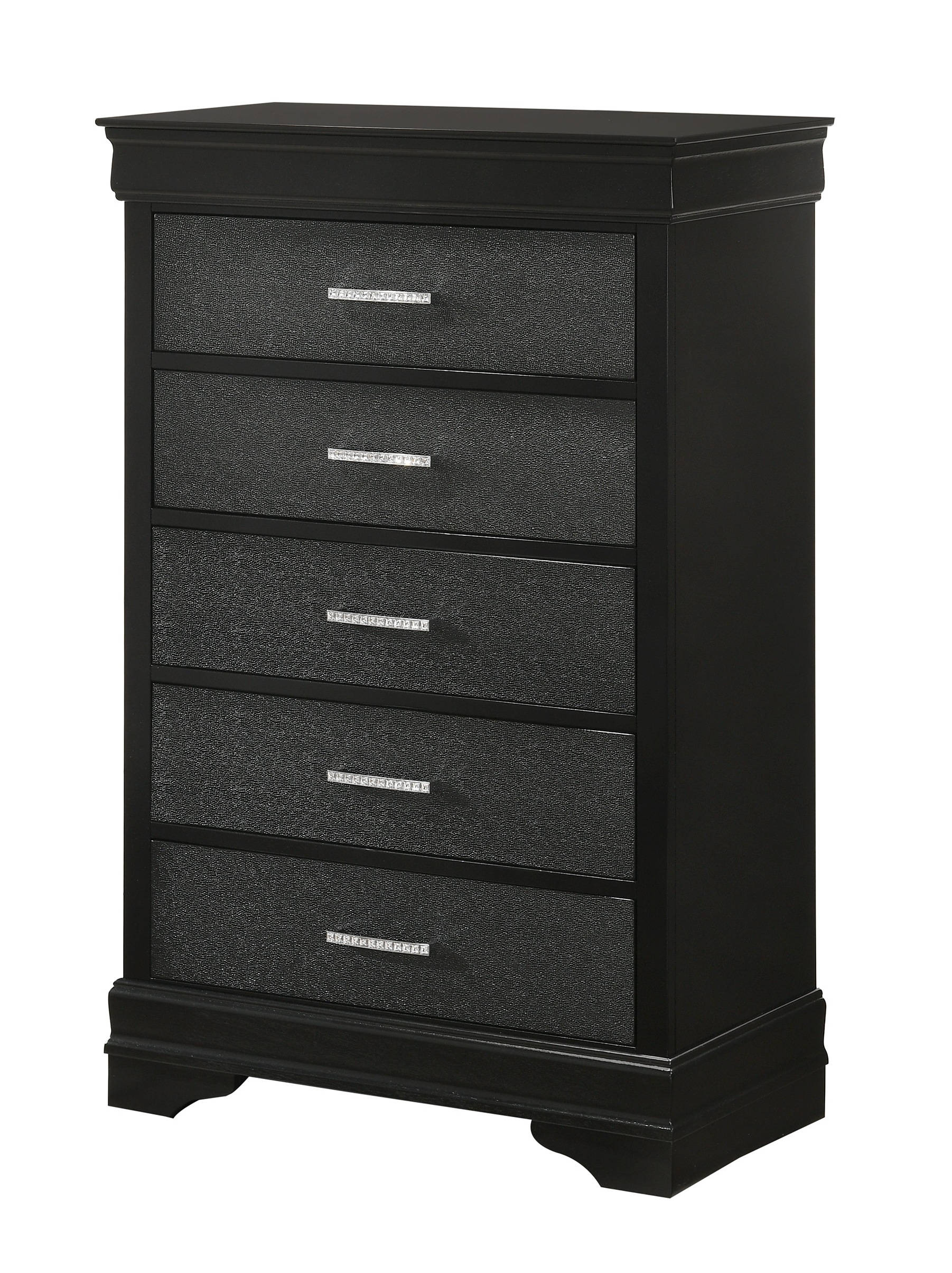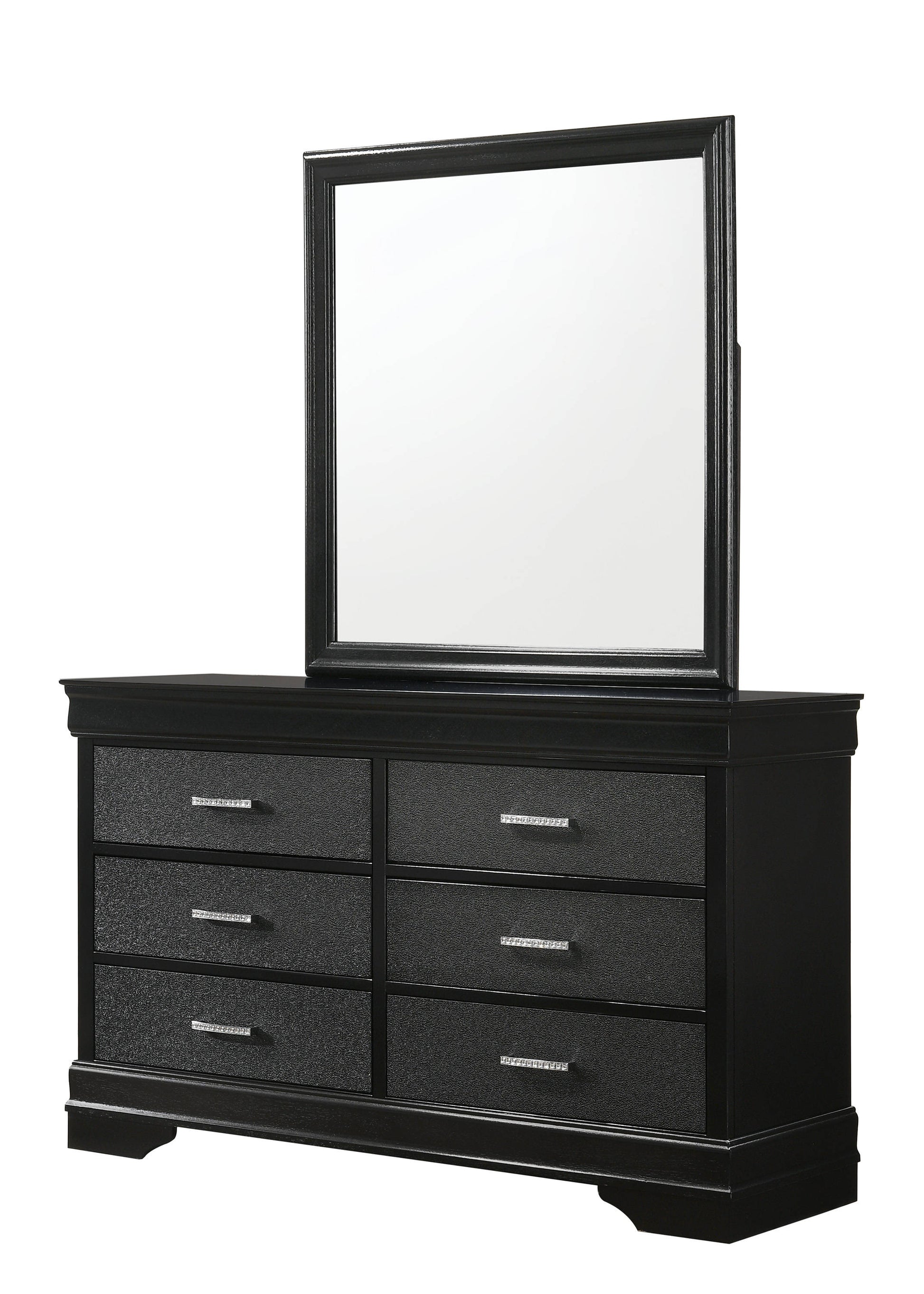 This bedroom set embodies a refined elegance with its crisp white hue and luxurious textures, perfect for creating a serene and sophisticated sanctuary. The centerpiece is a sumptuous bed framed by a headboard with diamond-tufted detailing, offering a touch of opulence. The accompanying pieces, including a dresser with a gracefully matching mirror, tall chest, and nightstand, all feature a textured finish that adds depth and character to the suite.