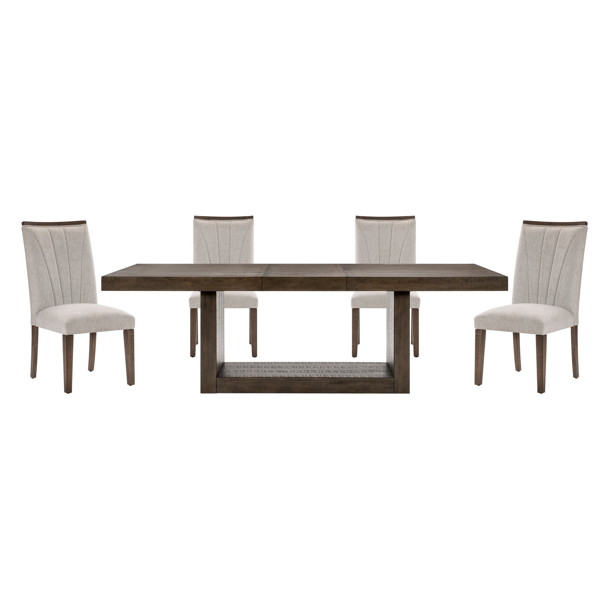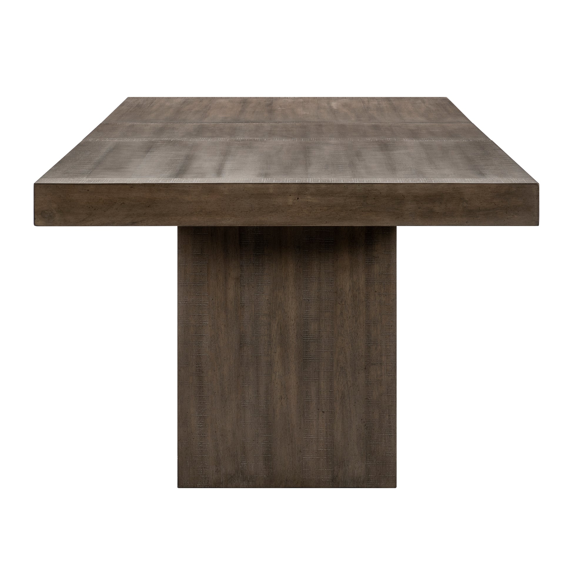 In a break from the minimalistic styling of contemporary design, the Brookings Collection provides a substantial platform for your dining pleasure. The acacia veneer of the collection is treated to a brown finish, its hue a neutral addition to your space. An open box-frame rectangular pedestal supports the tabletop. The collection’s side chairs feature textured gray fabric seats with a wood top-rail and fan-stitched seatbacks. An accompanying server provides ample behind door in-space storage for your linens and tabletop décor.