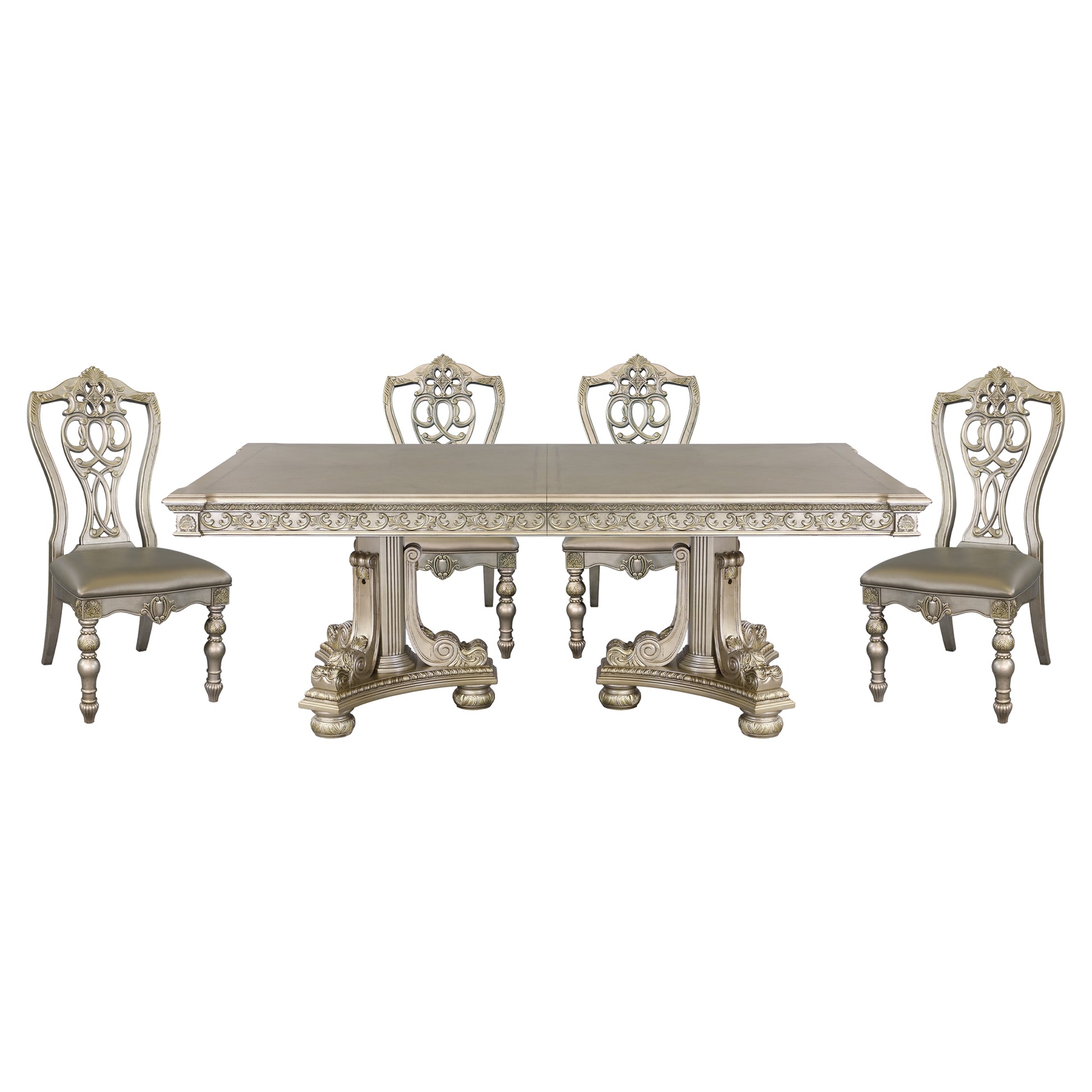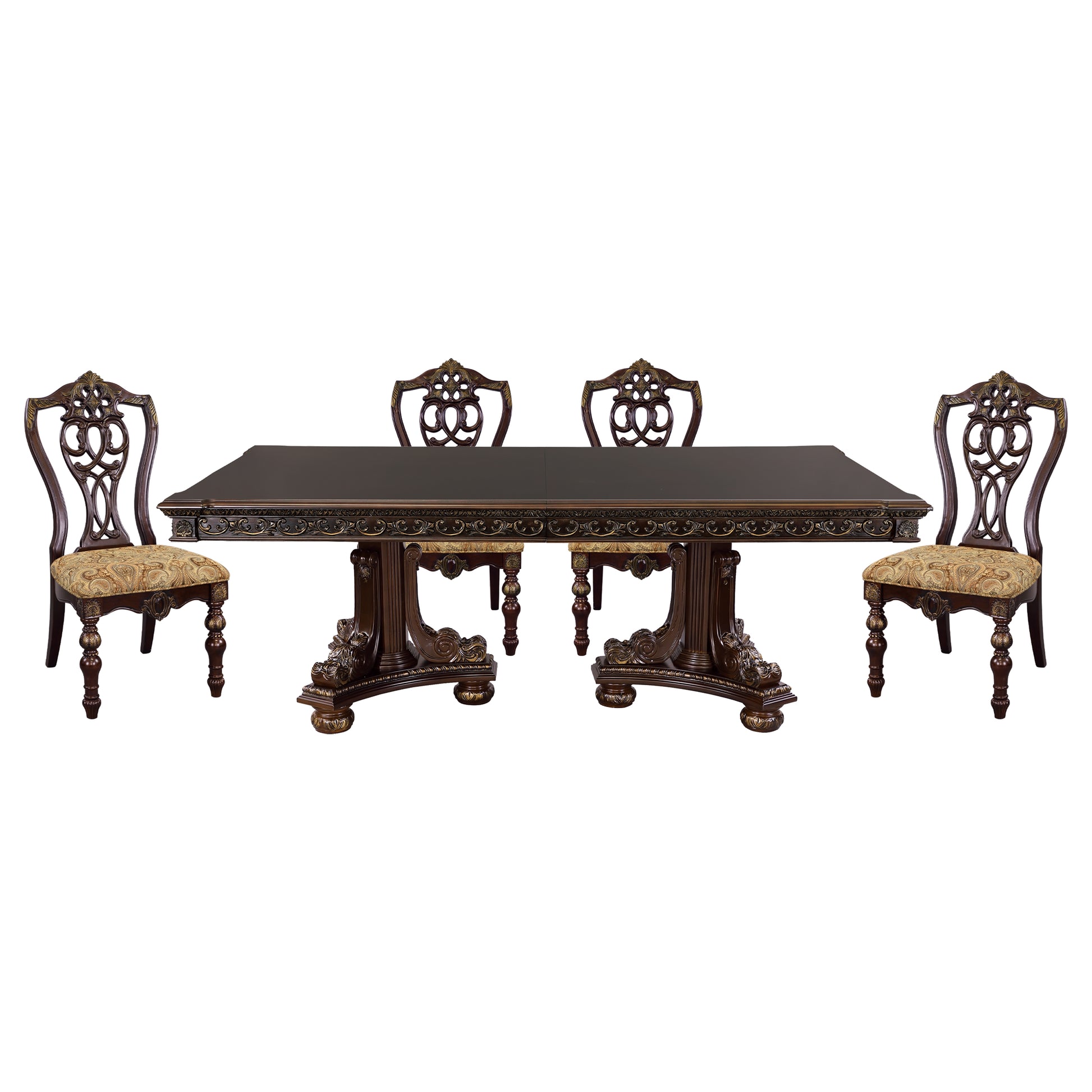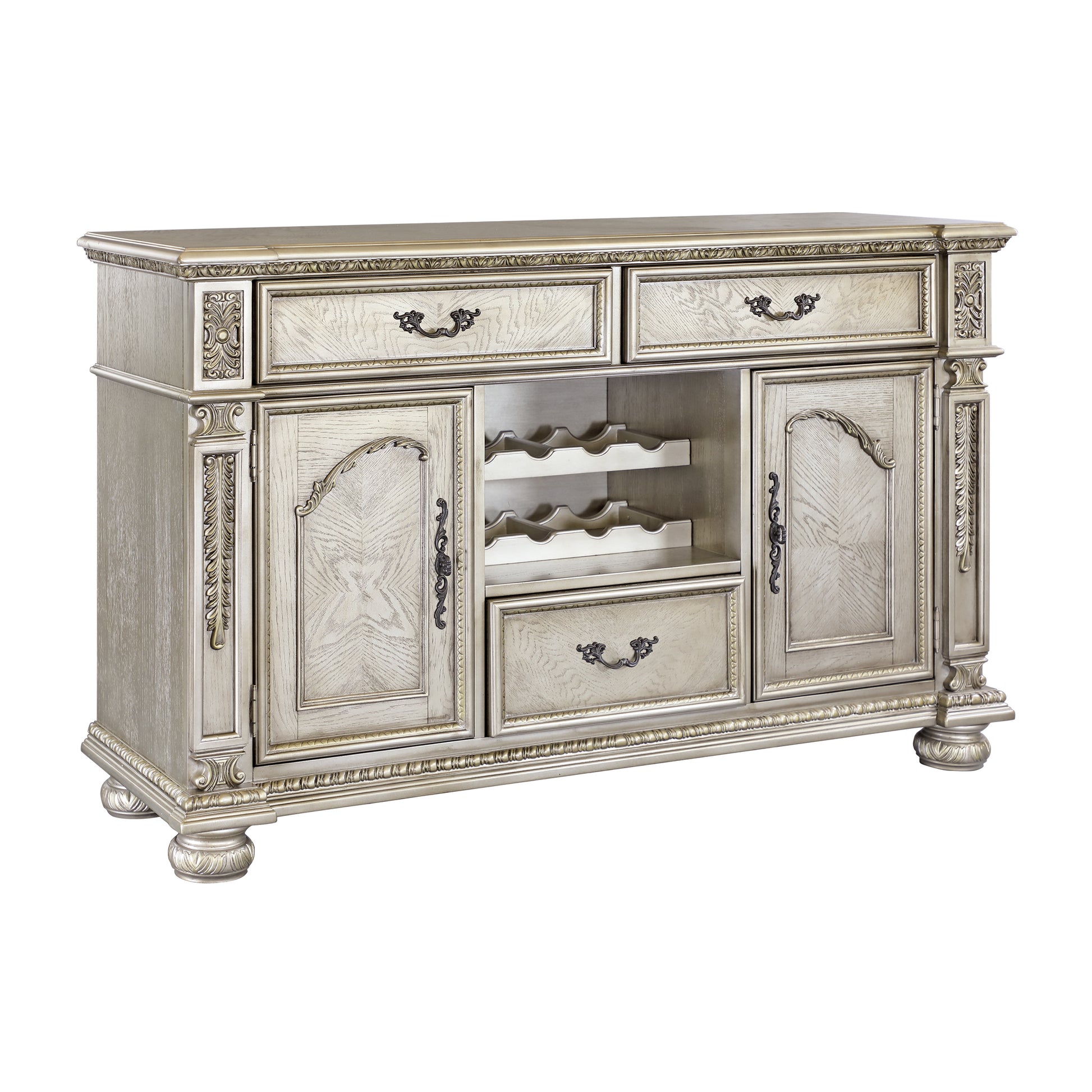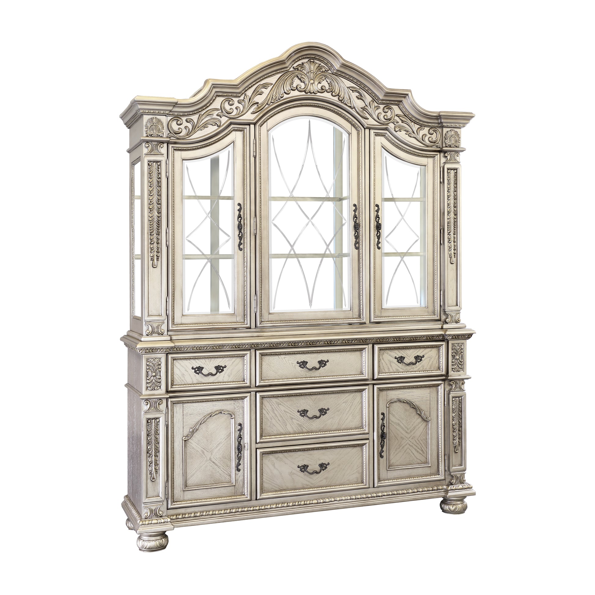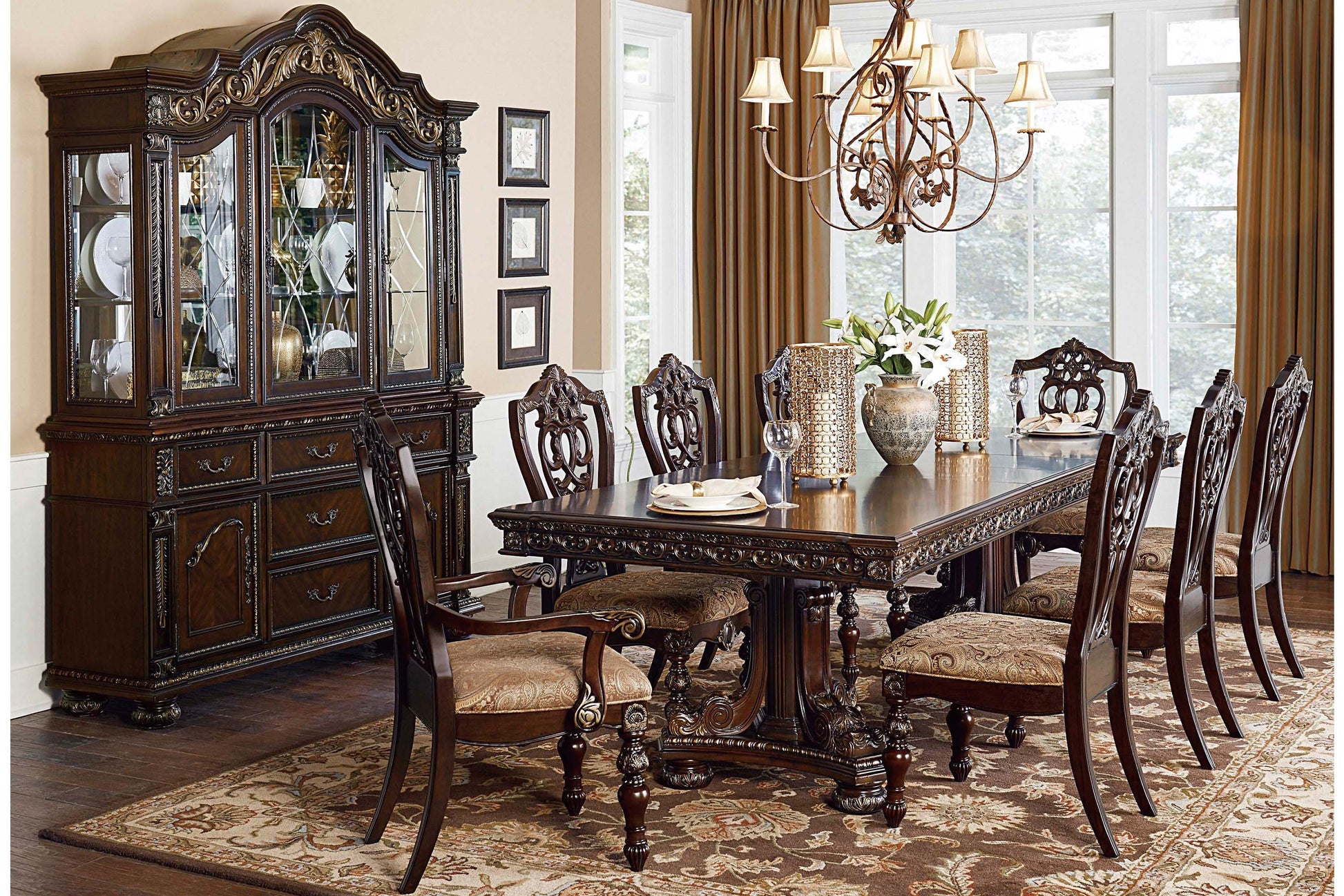 Old-World European styling is captured in the dramatically elegant Catalonia Collection. Traditional design elements reign at every turn – egg and dart molding, acanthus leaf carving, bead molding, gold tipping and extravagant carvings – creating a sophisticated look for your dining room. Each drawer front of the china and server features dark bronze fixed-drop hardware with decorative flourish that furthers the elegant appointments that embellish this collection. The shield back chairs feature elegantly patterned fabric seats. A traditional platinum gold finish is utilized to highlight the cherry veneer of the set and subtle decorative inlay pattern found on the table’s top.