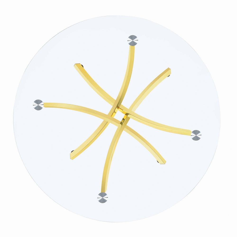 Stay on the edge of contemporary glamour. This dinette set indulges a love of clear glass and embellishes it with a radiant brass finish frame. Artfully designed, its base offers eye-pleasing contoured strips. A round glass top delivers sophistication and elegance. This gorgeous table features floor-protecting discs under each leg. While the sleek design on the Upholstered chair boasts a gracefully contoured leg frame with an upholstered seat and back. The classic glamour of a shiny brass finish on the legs complements the leatherette upholstery.