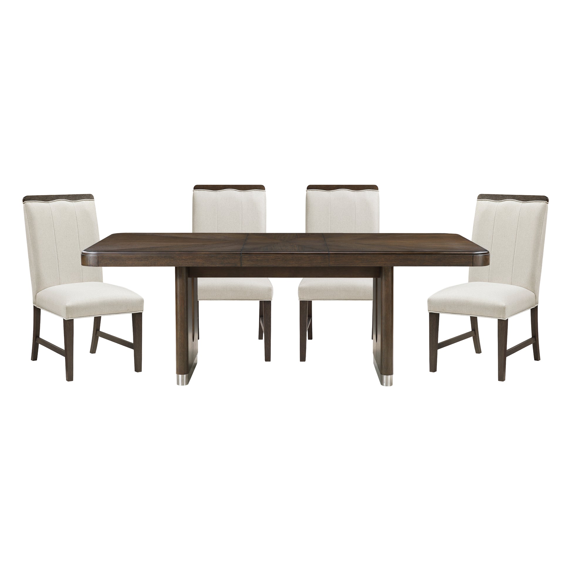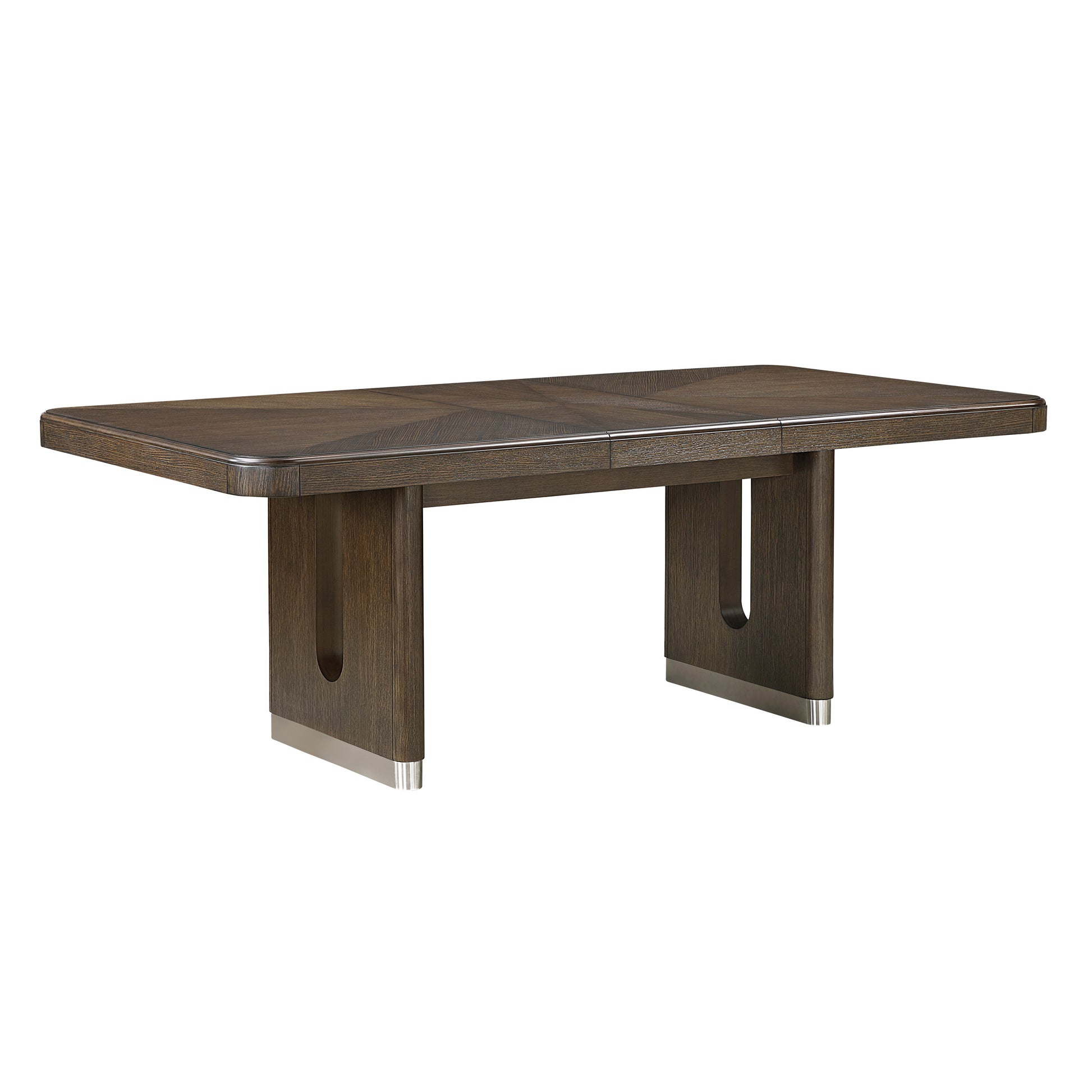 Elevate your dining space with this sophisticated modern collection, finished in a beautiful wire-brushed brown. The centerpiece is a versatile extendable dining table that comfortably seats six with a removable leaf, featuring a durable oak veneer top and a unique base with subtle metallic accents. The coordinating dining chairs are upholstered in a textured fabric for comfort and built on a sturdy plywood frame. This collection is completed by a highly functional server with three cabinets, adjustable shelves, and elegant metallic handles. The entire set combines robust construction with a sophisticated aesthetic to create a cohesive and functional dining area.
