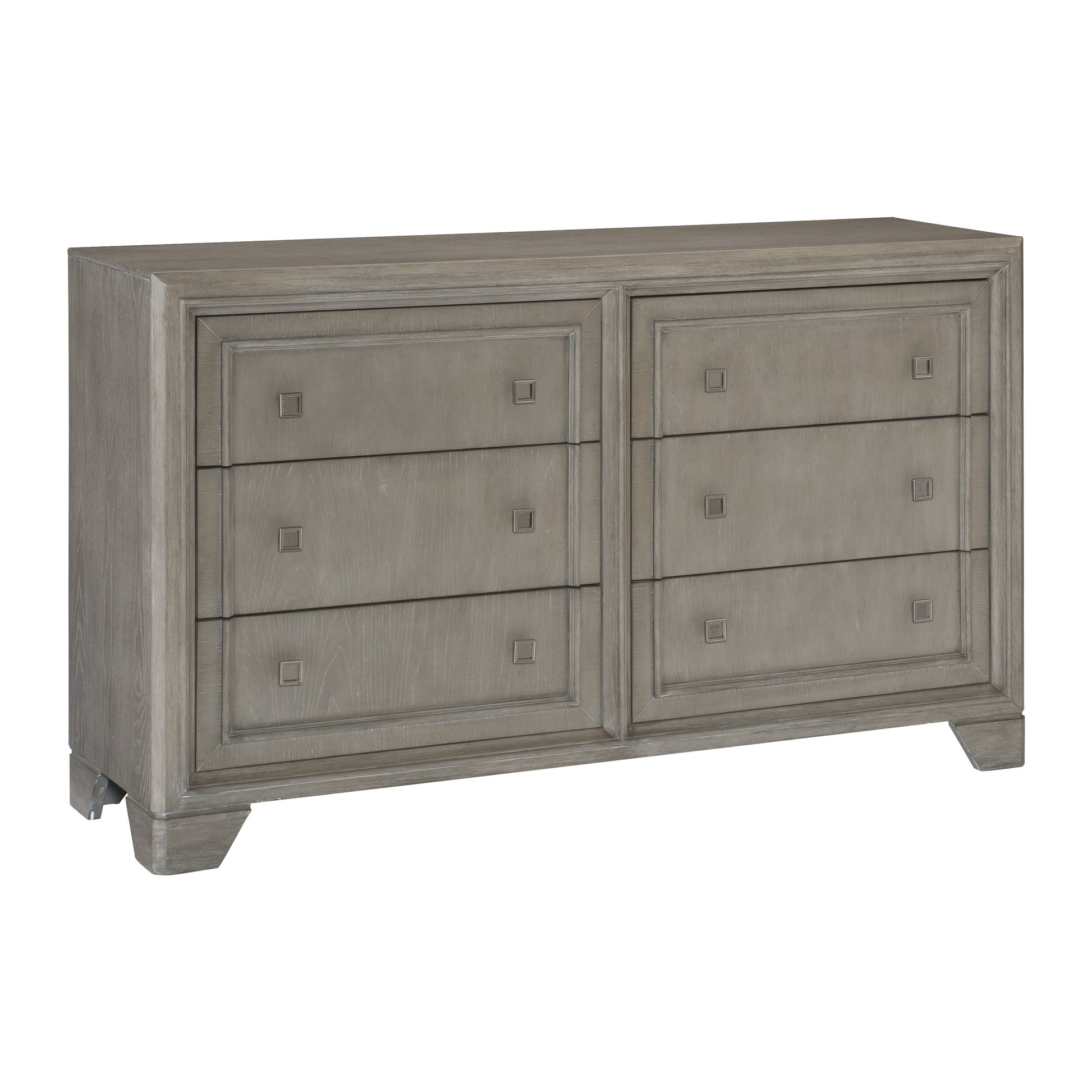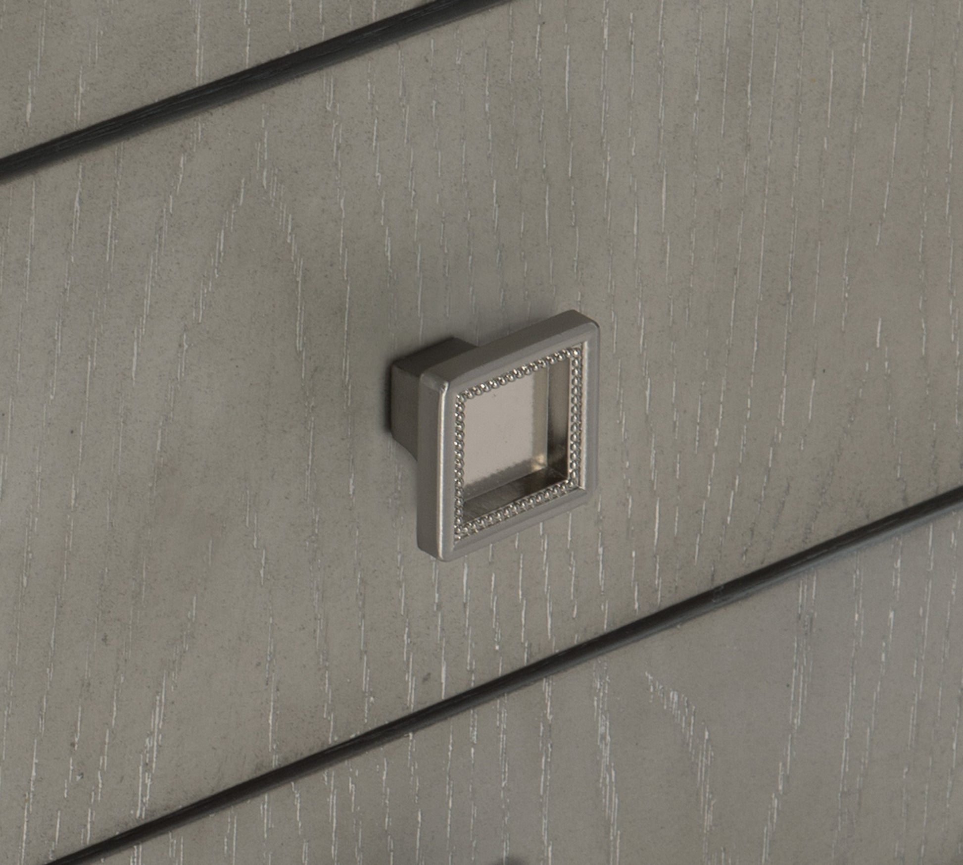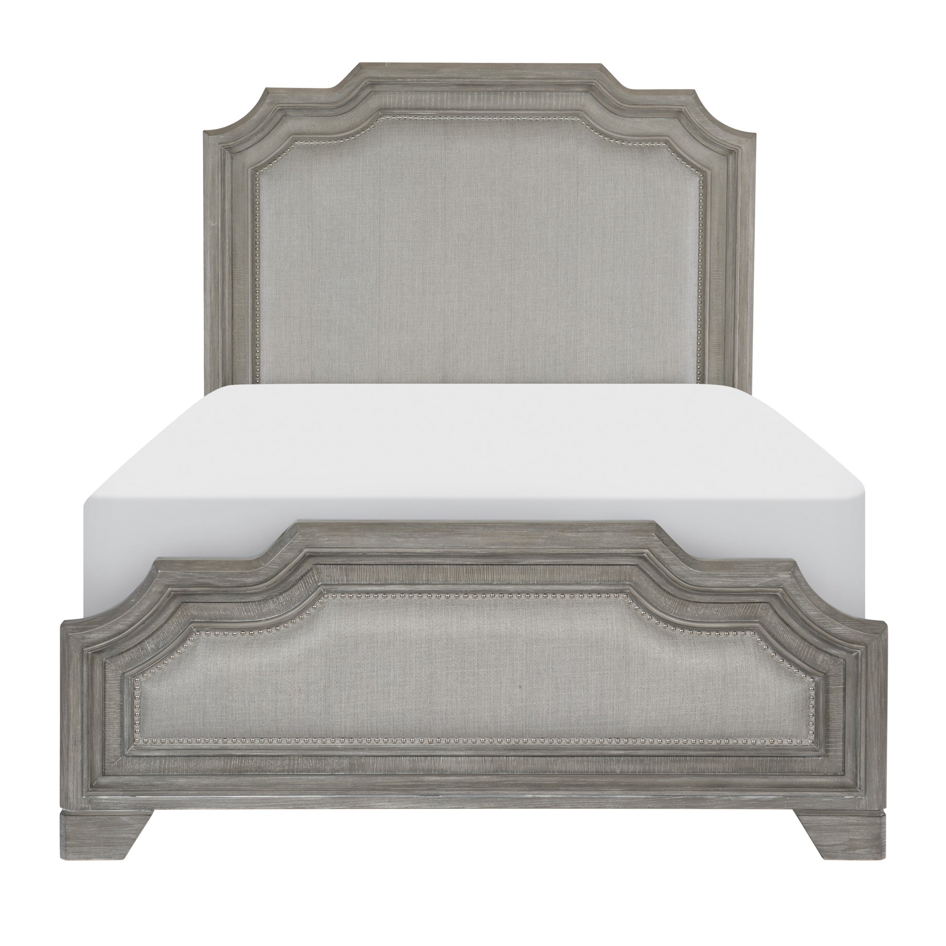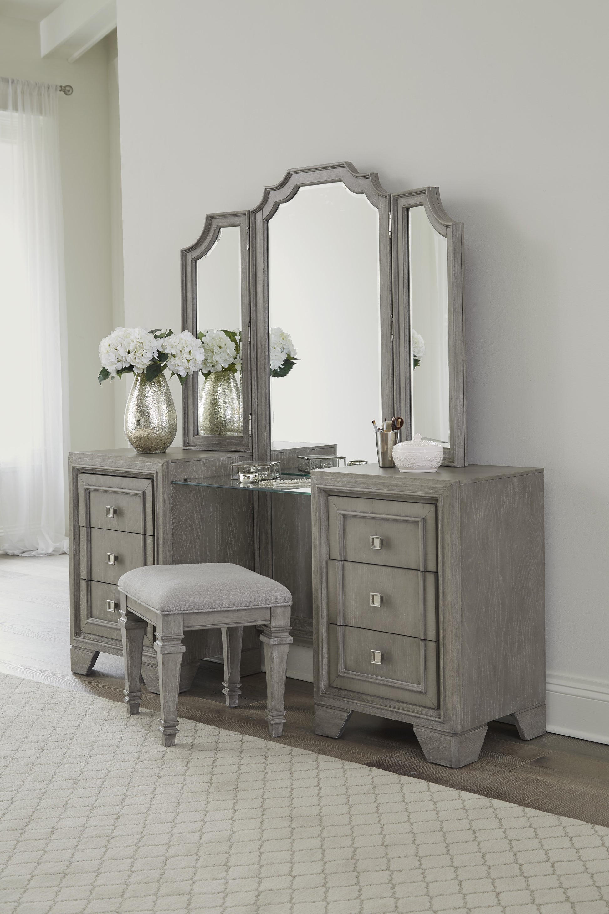 In the Colchester Collection, a modern take on traditional design creates an elegant profile for your bedroom’s décor. The driftwood gray finish of the collection is complemented by the gray fabric and nailhead accent of the headboard and footboard, with silver finished hardware providing complementing contrast to the fronts of the case pieces. Framed drawer fronts and picture frame molding further the classic look of the collection. The available vanity features tri-fold mirror, glass top, drawer units and jewelry hooks on the back of the side mirrors.