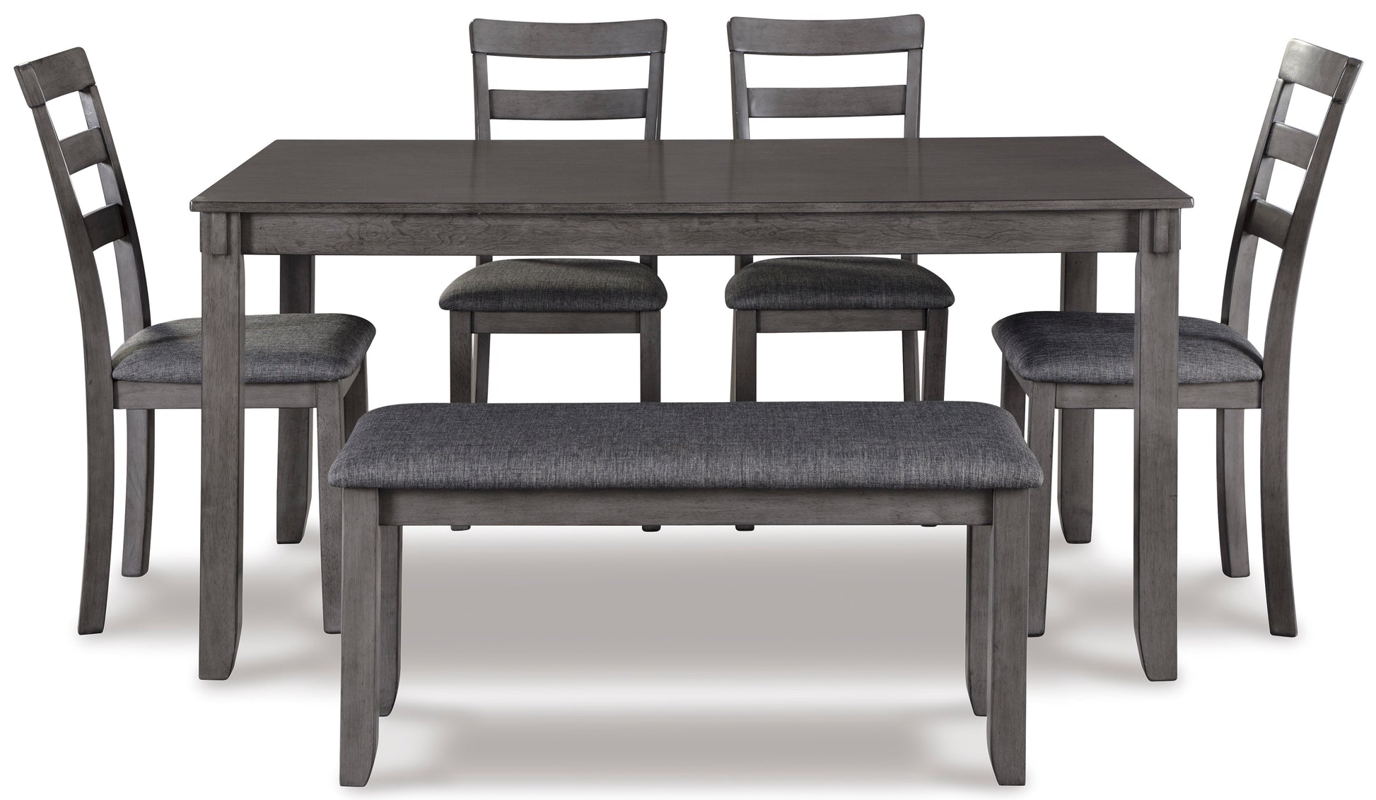 It’s so easy being gray—at least this 6-piece dining set makes it seem that way. This transitional dining table set sports a charcoal gray finish with textured gray upholstery for an on-trend and relevant appeal. Plushly upholstered seat cushions in a practical polyfiber make it a pleasure to linger at the table. Brilliantly styled seating choices add interest and versatility at mealtime.