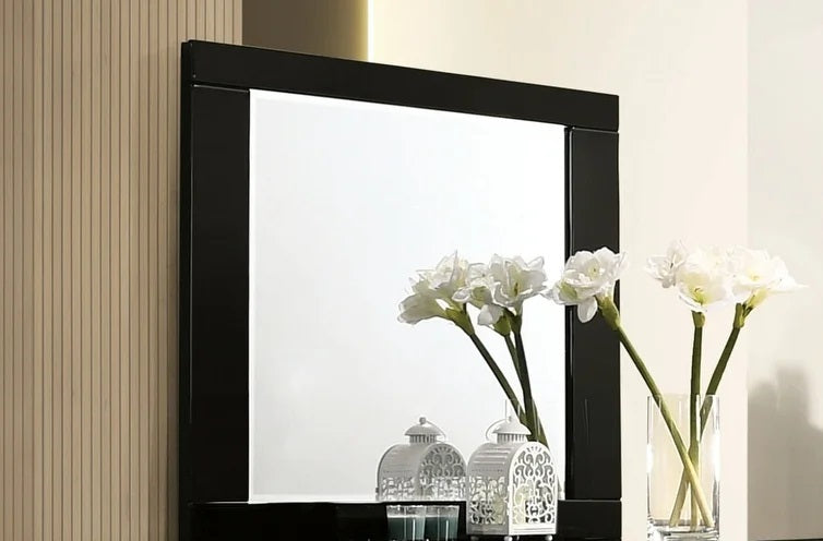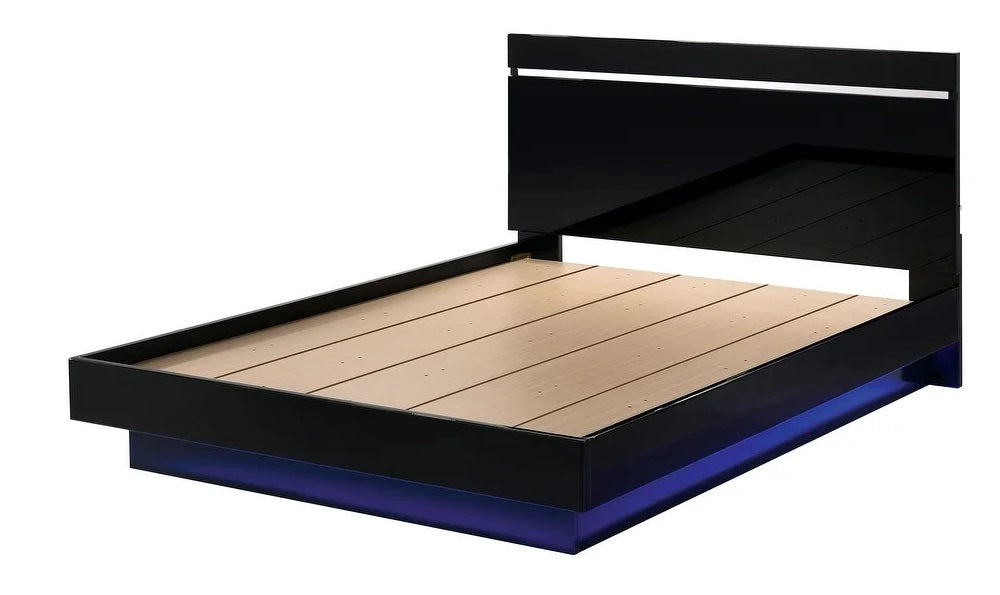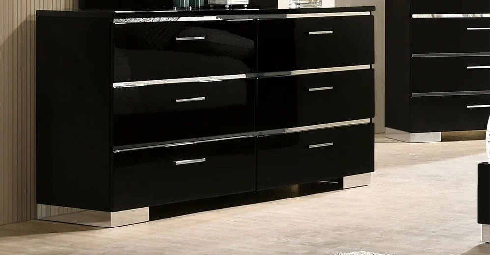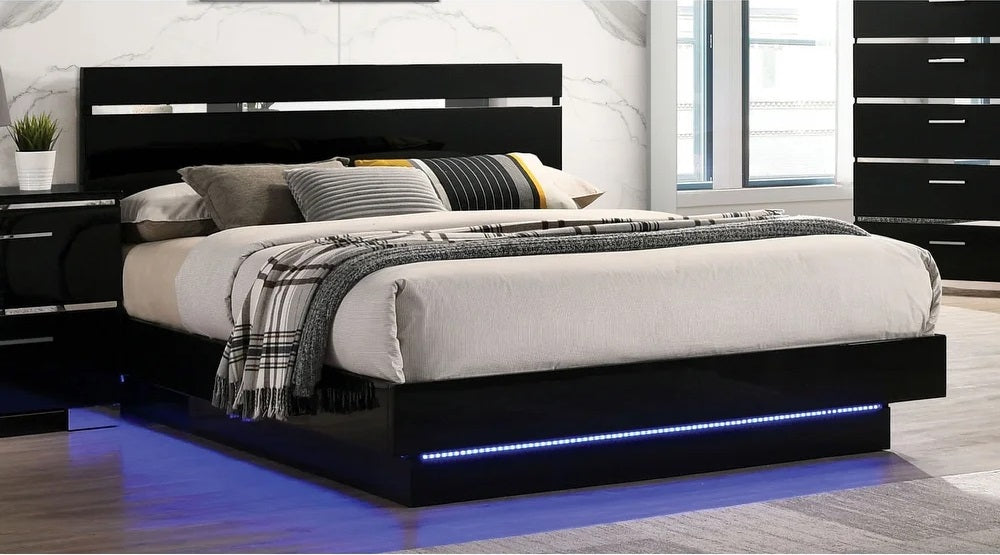 Be ready to set the right mood anytime with this tantalizing bedroom set. The main draw here is of course, the ambient LED lighting lining the bottom edges of the platform bed, reminiscent of neon lights of the olden days. Reflecting light beautifully to add to the daring environment, the chrome accents on the headboard match those of the case goods. Finished in sleek, glossy black, this ensemble is a testament to the enduring allure of futuristic settings amped with nostalgic flair.