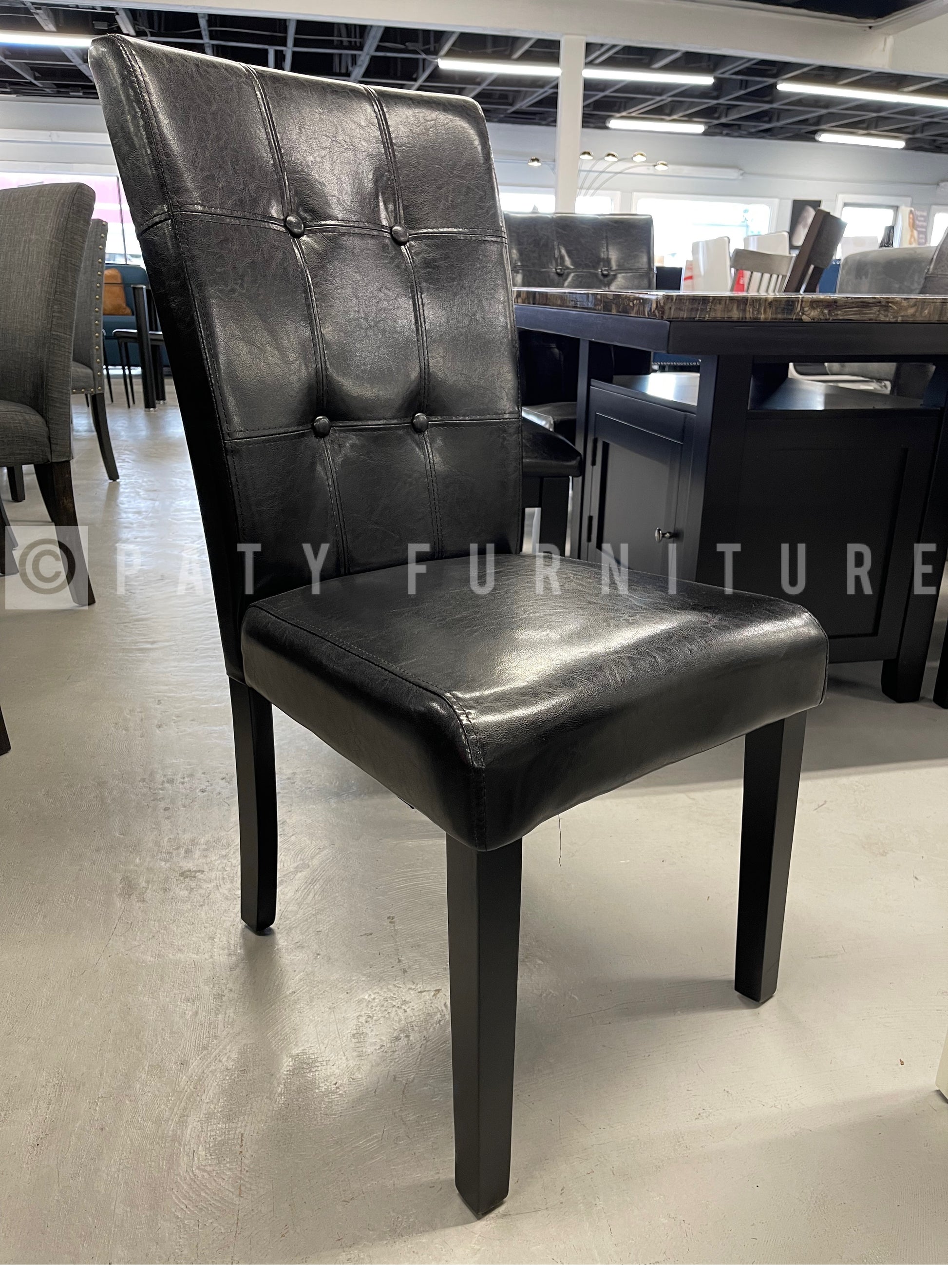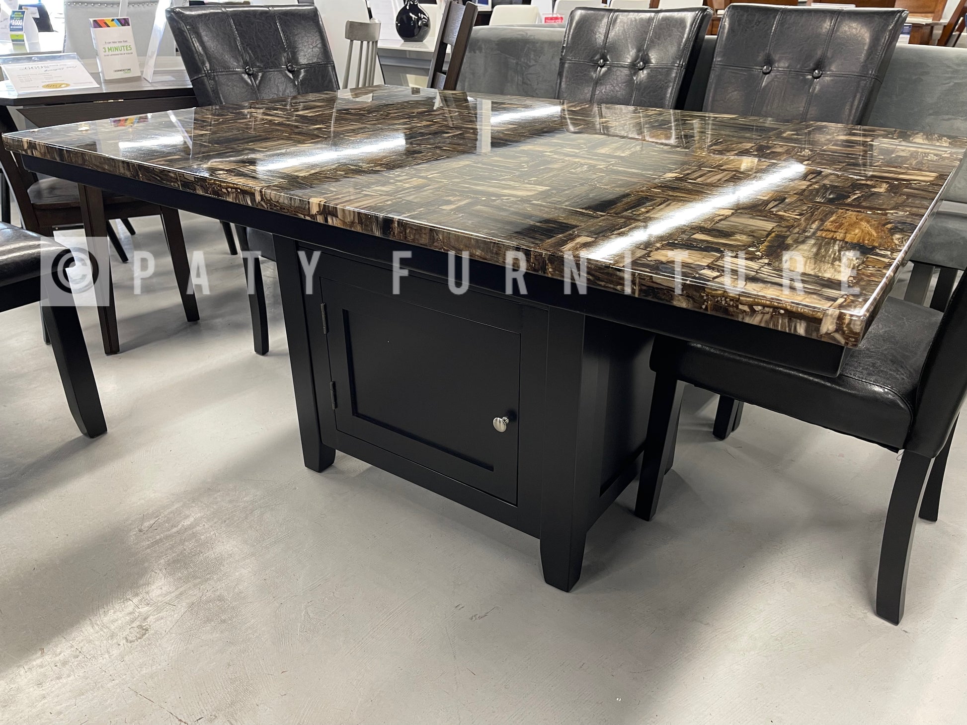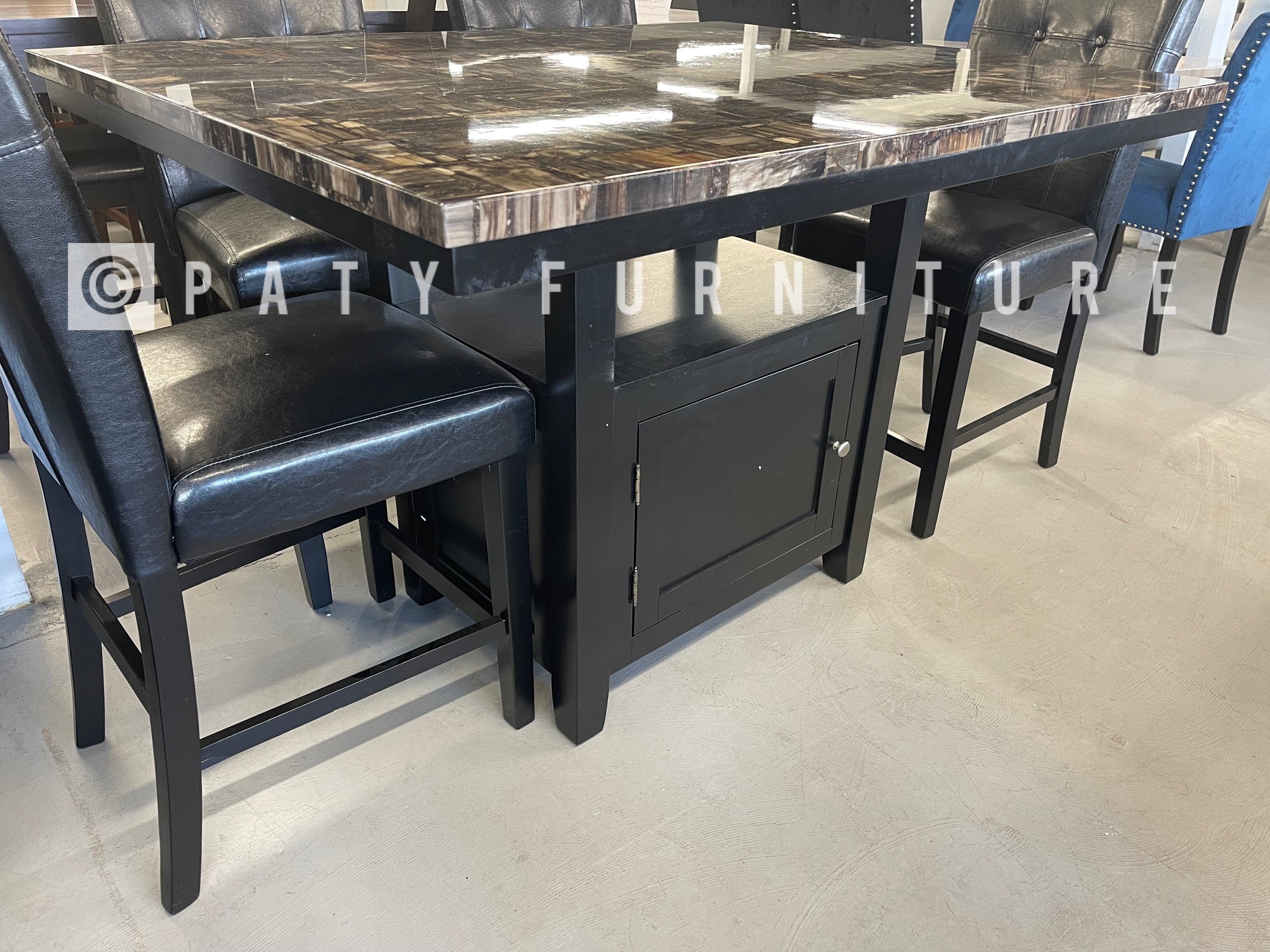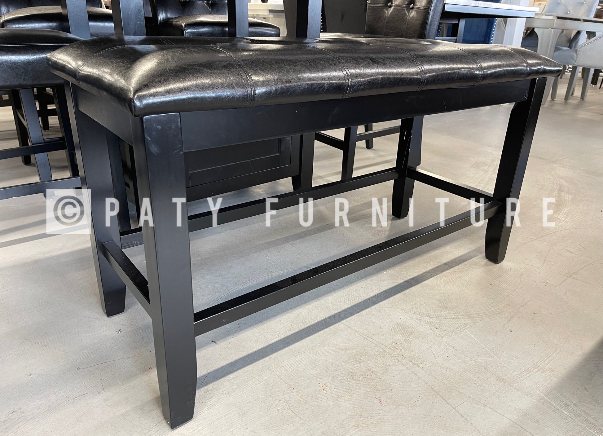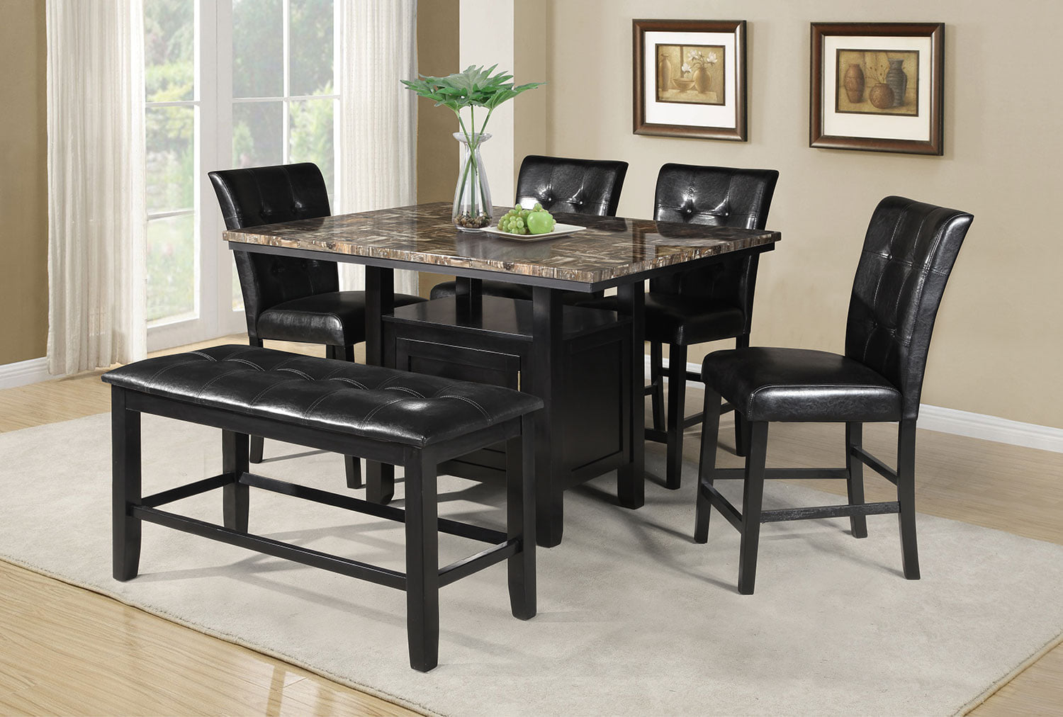 Rainier collection with a Faux marble top table and black finish base chairs and bench upholstered on faux leather on a black finish perfect for family to gather round to share a meal. Available on Counter height.