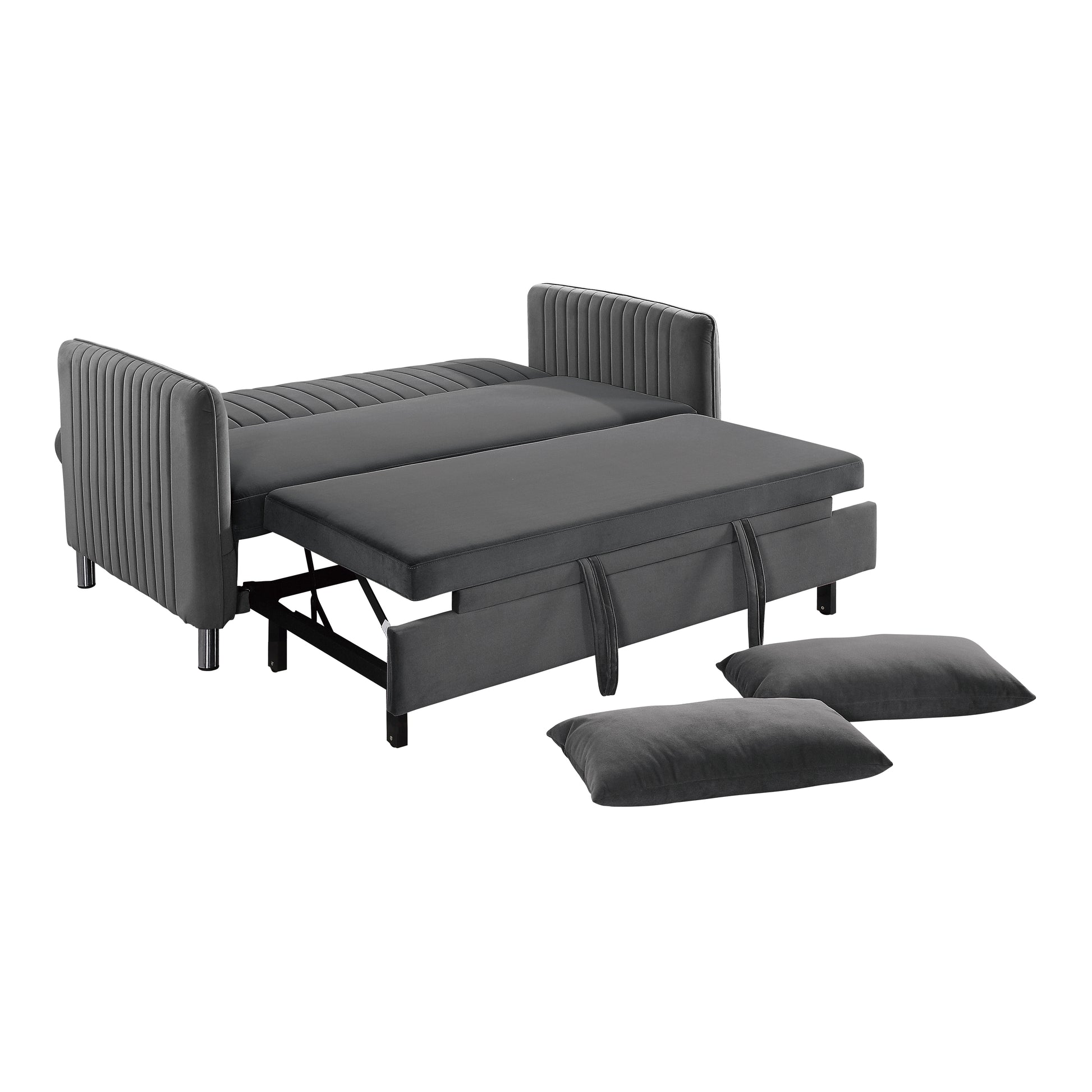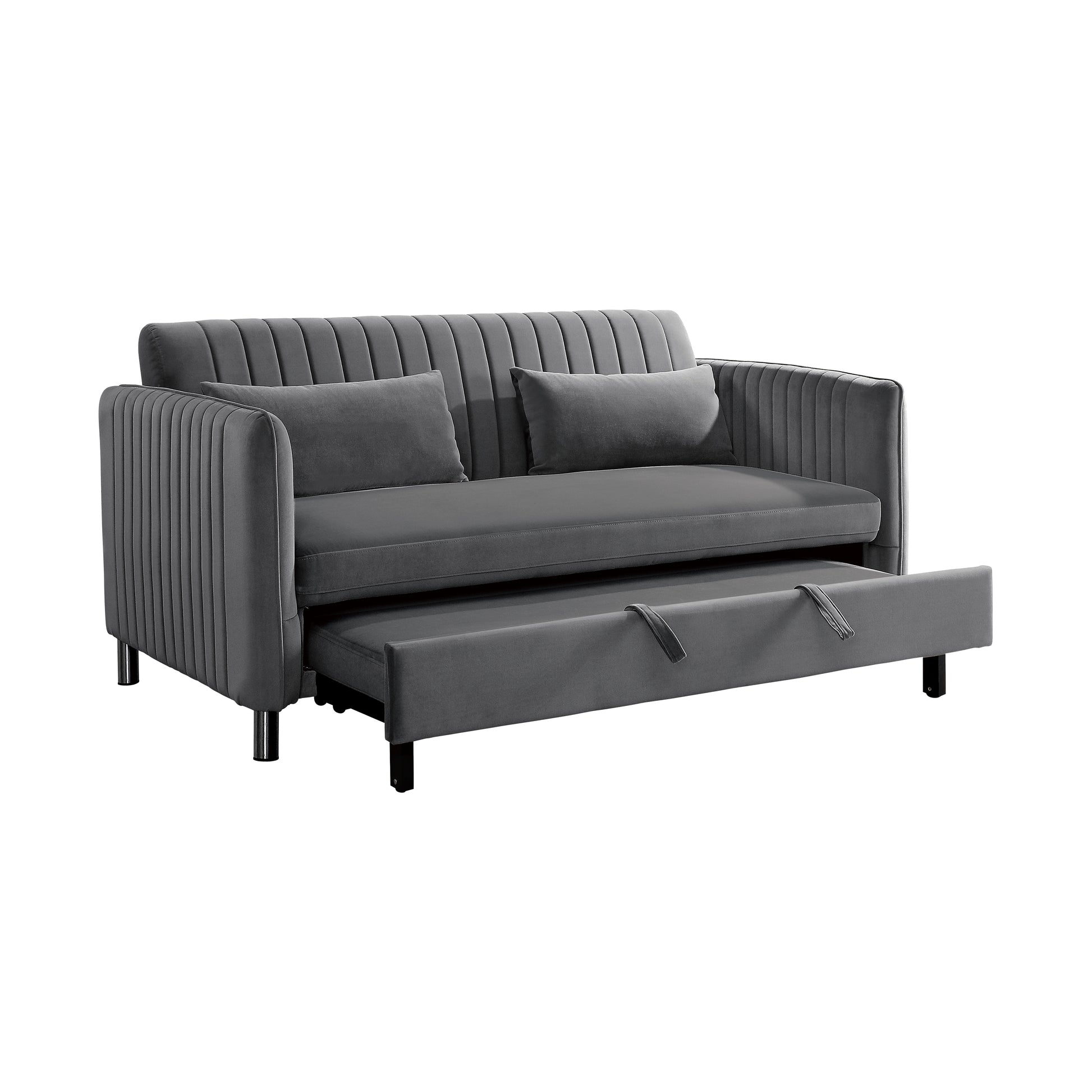 With versatility of function, the Greenway Collection presents as a unique seating option for your household. The pull-out bed and click-clack mechanism seat back of this sofa engage to create a platform for sleeping or relaxing. Offered in a brown-gray velvet cover for decorative neutrality and soft touch, the classic design furthers the placement ability within a number of home environments.