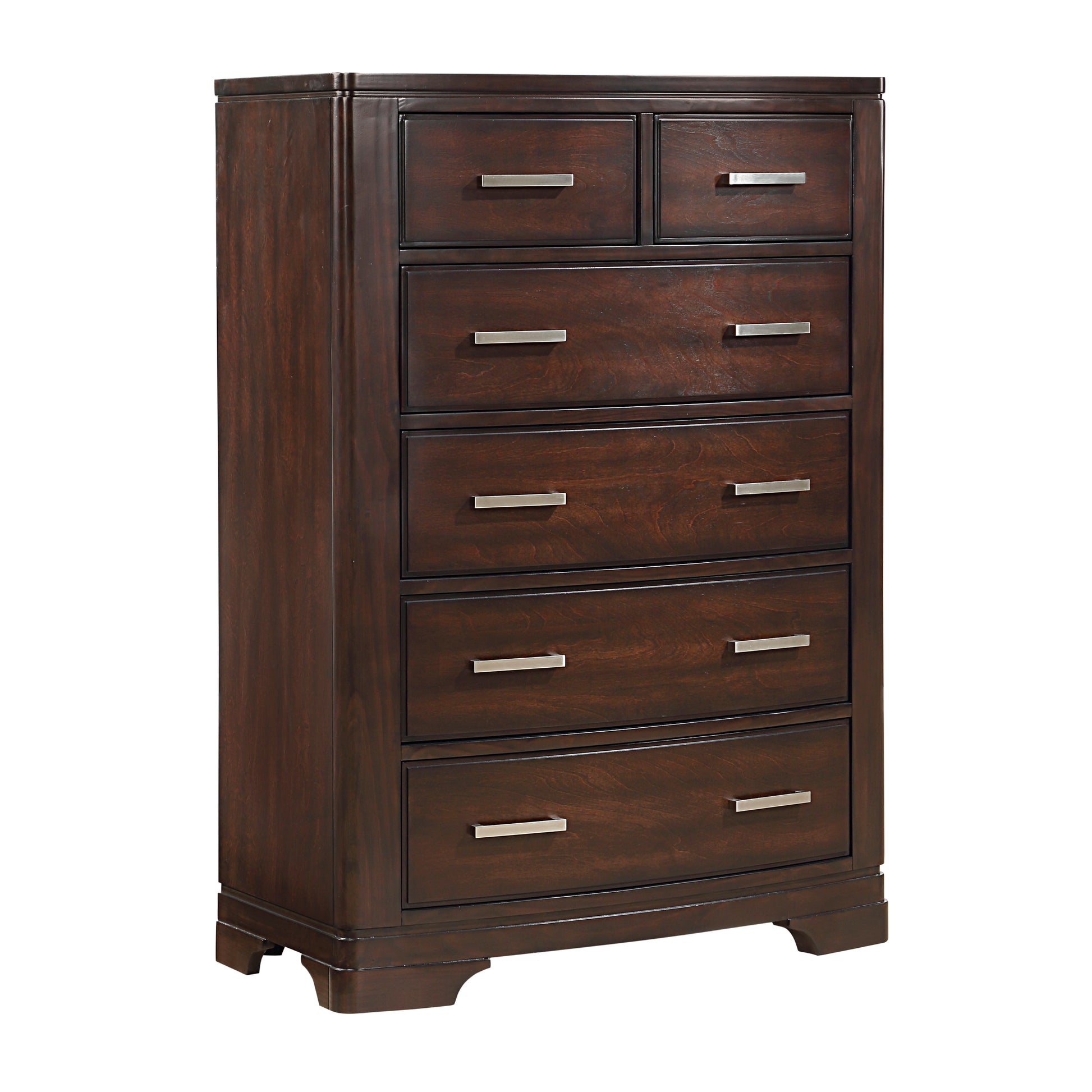 The intersection of modern lines and understated transitional style blend to create the Hudson Collection. Available in a white or cherry finish, the collection presents a decoratively versatile addition to your bedroom. Polished chrome bar hardware fronts the dresser, chest, nightstand, and storages drawers of the bed’s footboard. The curved design of the bed’s headboard carries over to the top rail of the mirror.