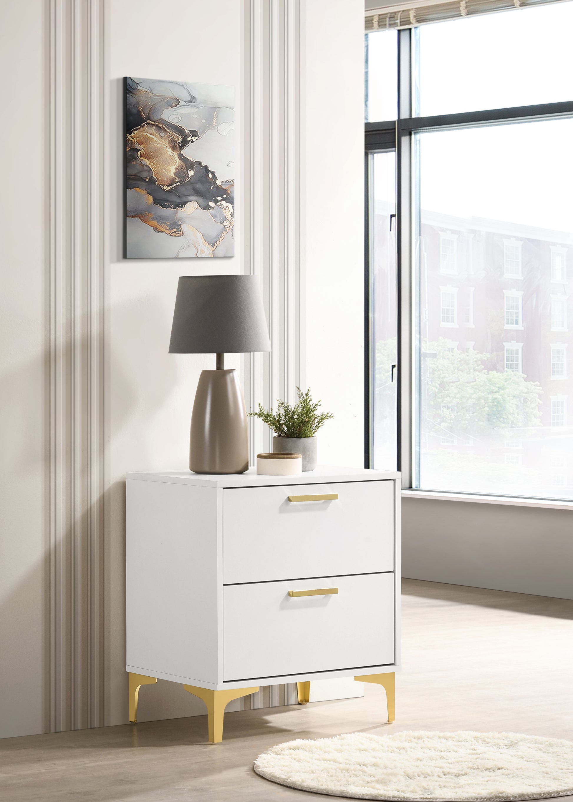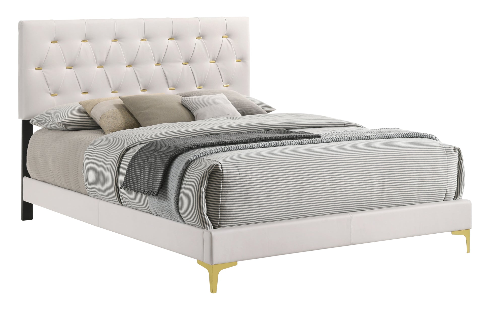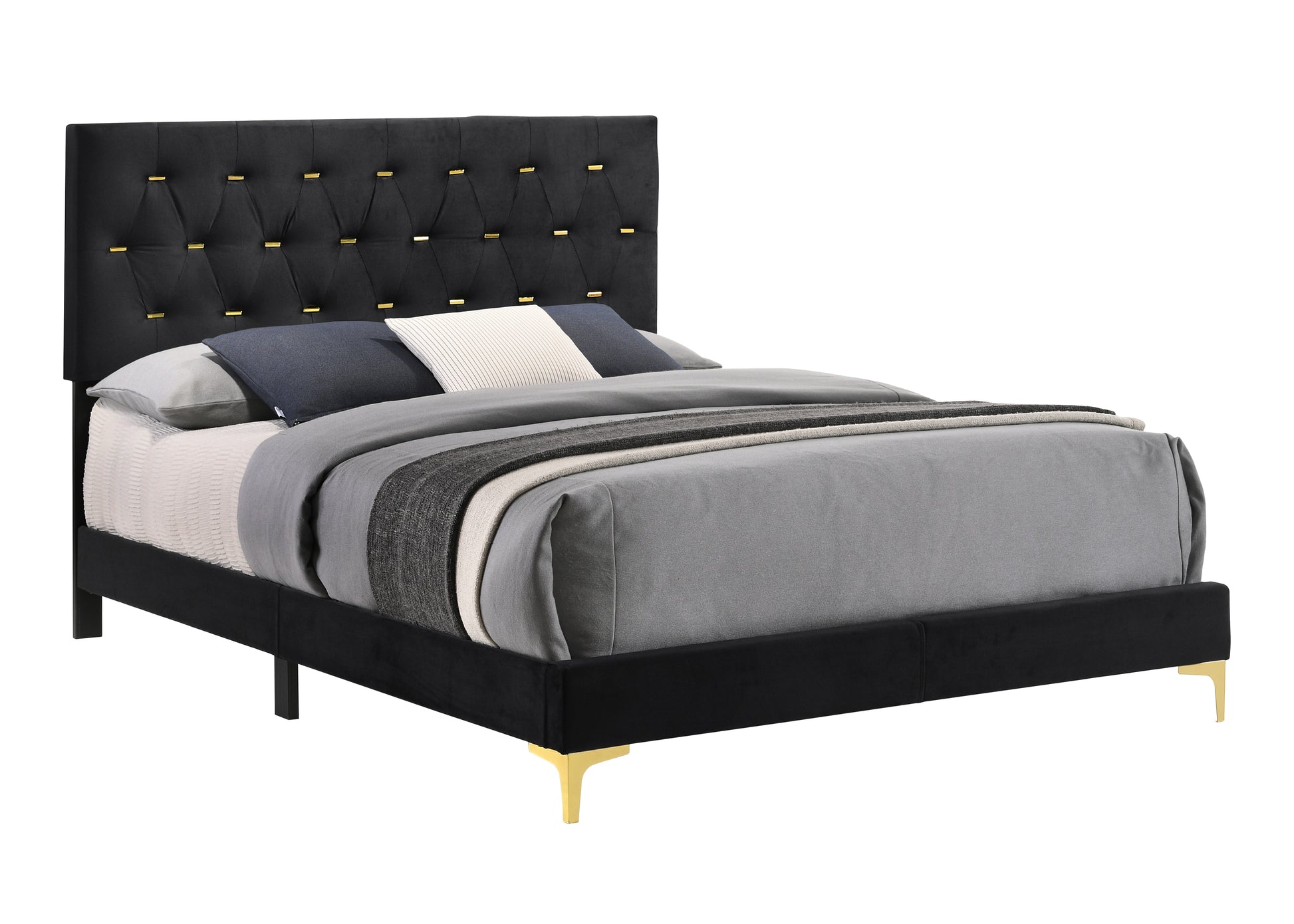 Welcome to the Kendall Collection, where modern luxury and functionality beautifully intertwine. The heart of the collection is a plush platform bed, its headboard adorned with diamond button tufting and shiny gold accents. Select between rich black or bright white velvet upholstery for the aesthetic that best suits your space. The collection extends its charm with a sleek six-drawer dresser, providing ample storage for your wardrobe. A chic two-drawer nightstand ensures your nightly essentials are always within reach. Each piece is accentuated by slender gold pull handles and bracket legs, adding a touch of glamour and sophistication. Whether you're drawn to the bold allure of black or the crisp simplicity of white, the Kendall Collection promises to elevate your bedroom with its elegance and stylish design.