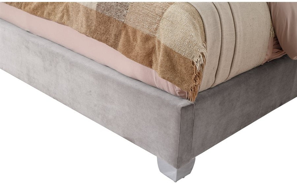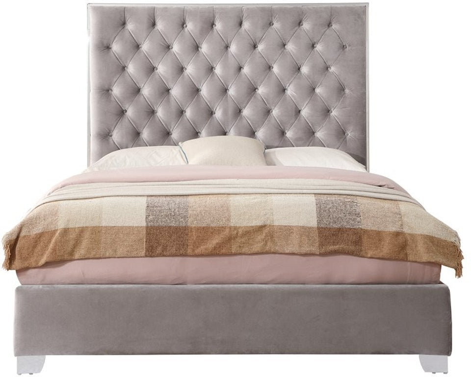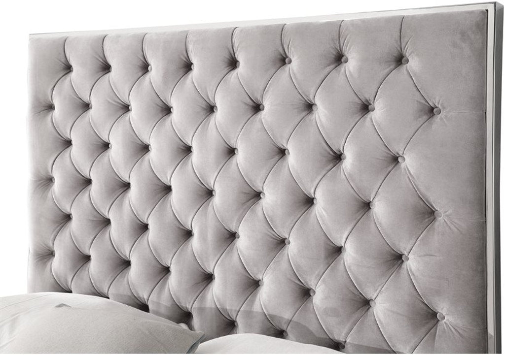 Create your sophisticated, luxurious master retreat with the Lacey bedroom collection. Luscious velvet-like fabric in silver gray is detailed with chrome trim and deep button tufts creating elegant softness. Transform your home with the stylish details and timeless beauty of Lacey!