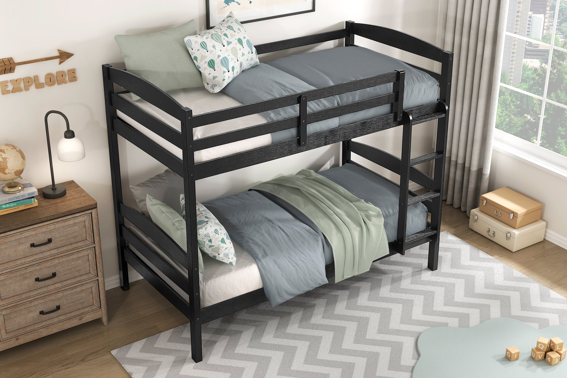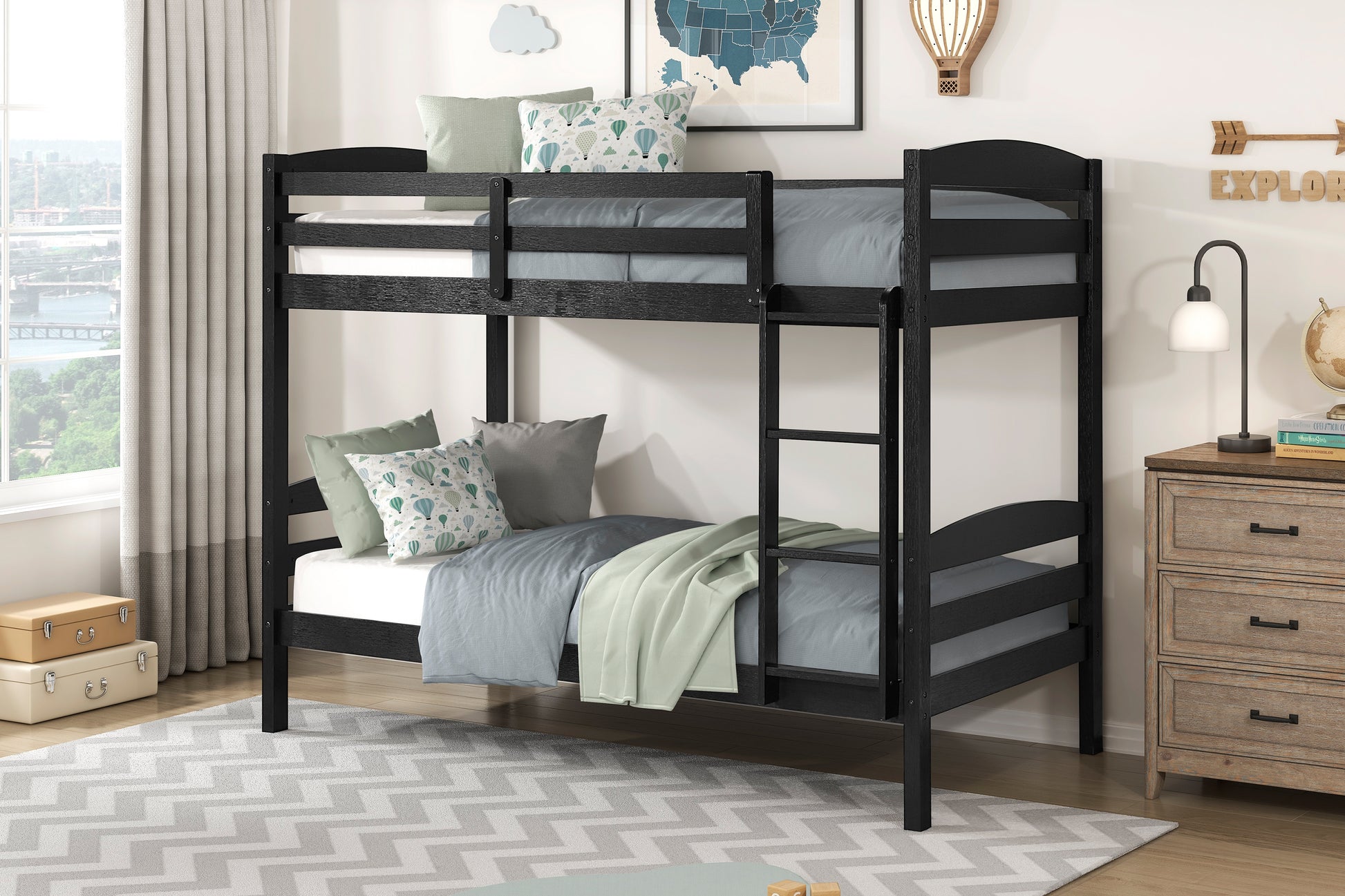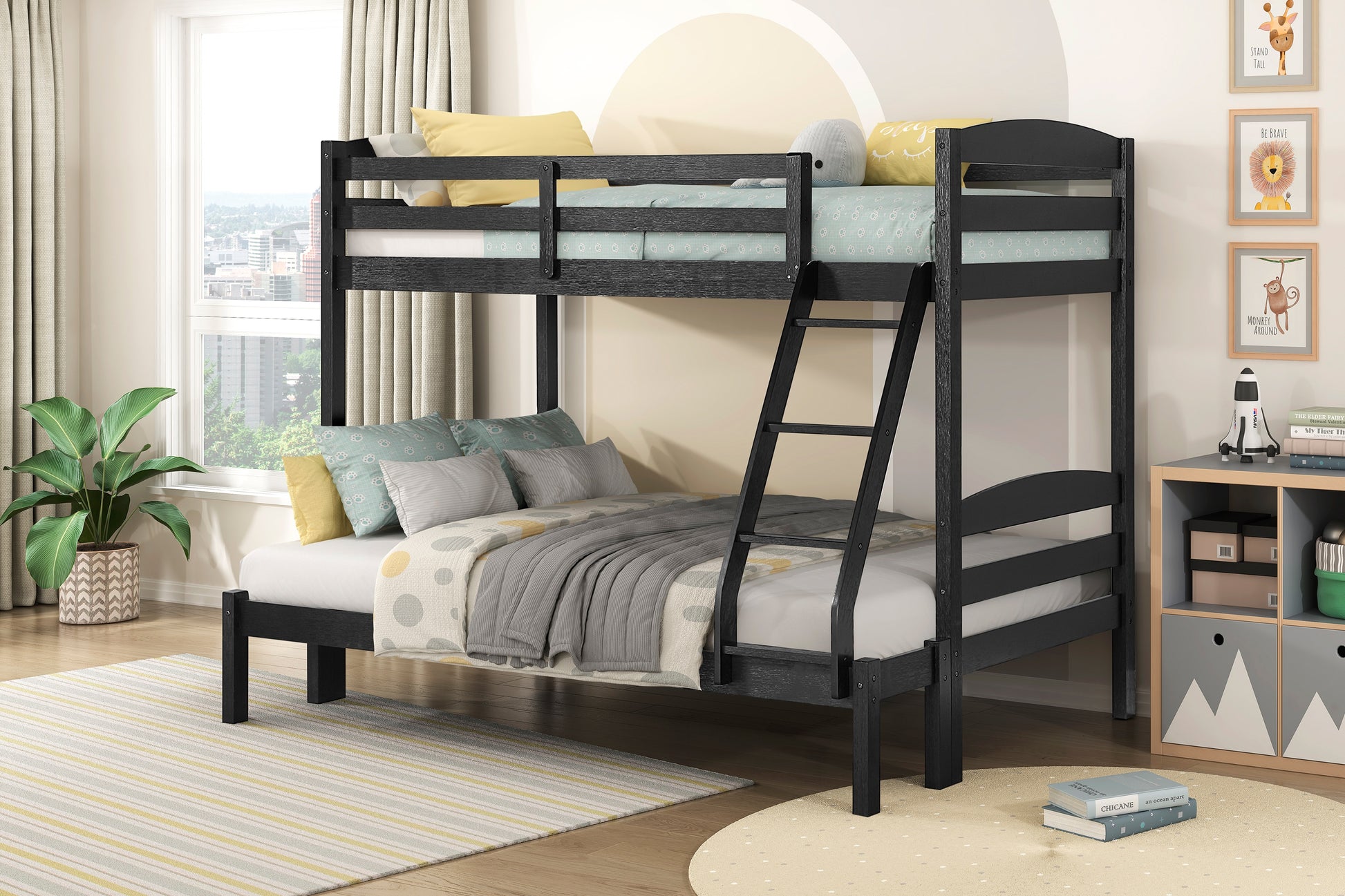 Maximize space and add functional style to any shared room with this sturdy bunk beds. Crafted from a durable blend of wood and engineered wood, and finished in a sleek wire-brushed black, these beds offer a contemporary look and robust stability. The top bunk is equipped with secure guard rails and a sturdy ladder for safe and easy access. An integrated slat system provides mattress support for both the top twin bunk and bottom full-size or twin bunk, eliminating the need for a box spring. These efficient and stylish sleep solutions are perfect for siblings or sleepovers, ensuring a safe and comfortable night's rest.