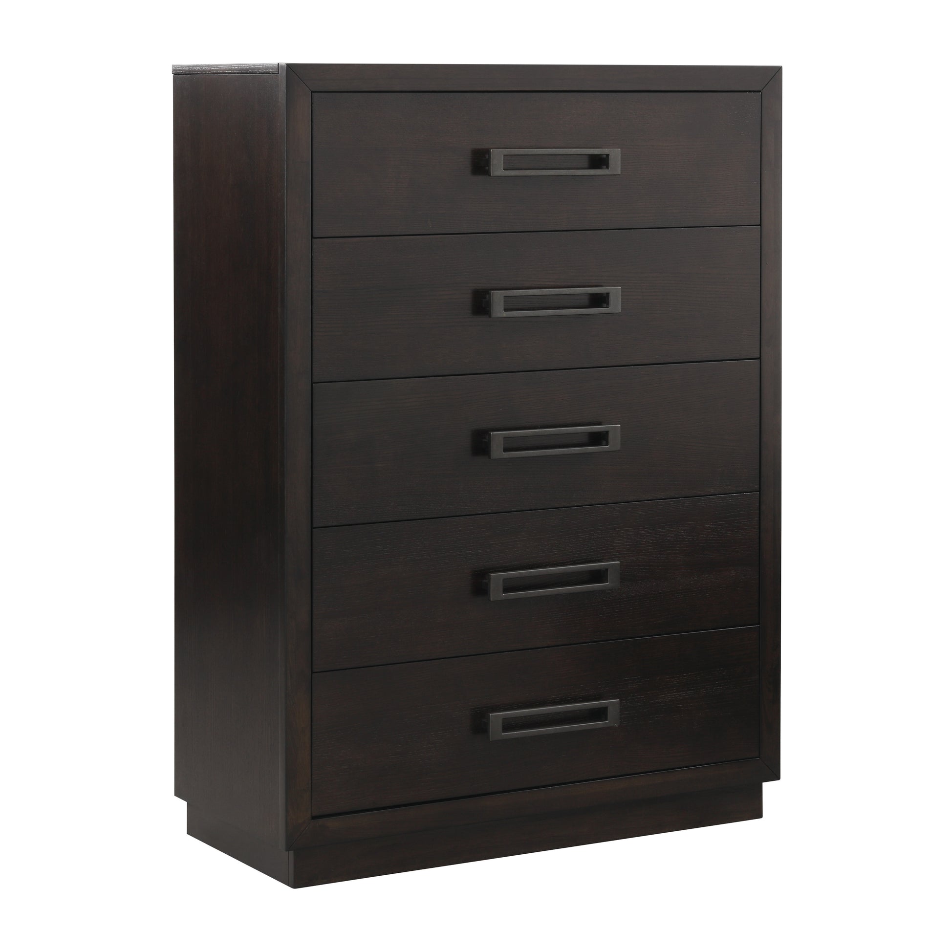 The striking profile of the Larchmont Collection is an intersection of texture, material and style. The charcoal upholstered bed, that centers the collection, features pin-tucked button tufting and nail head accent. Dark glass tops night stand and dresser for subtle reflection and textural interest. Prominent horizontal metal hardware is mounted on each drawer front, and is finished to complement the tone of the charcoal finish over ash veneer. The night stand open concept of the drawer features not only the aforementioned glass top, but also underside LED lighting and power strip – with USB port - for the ultimate modern touch.