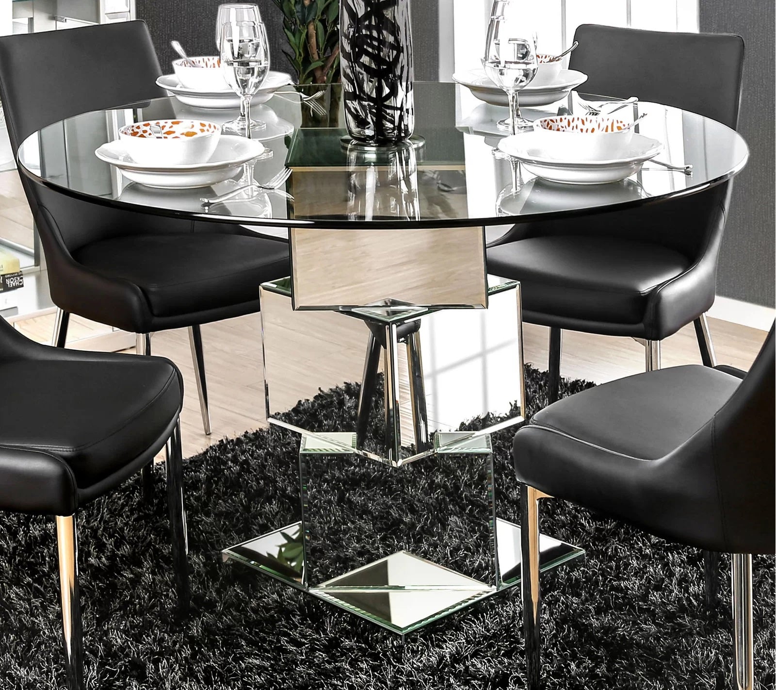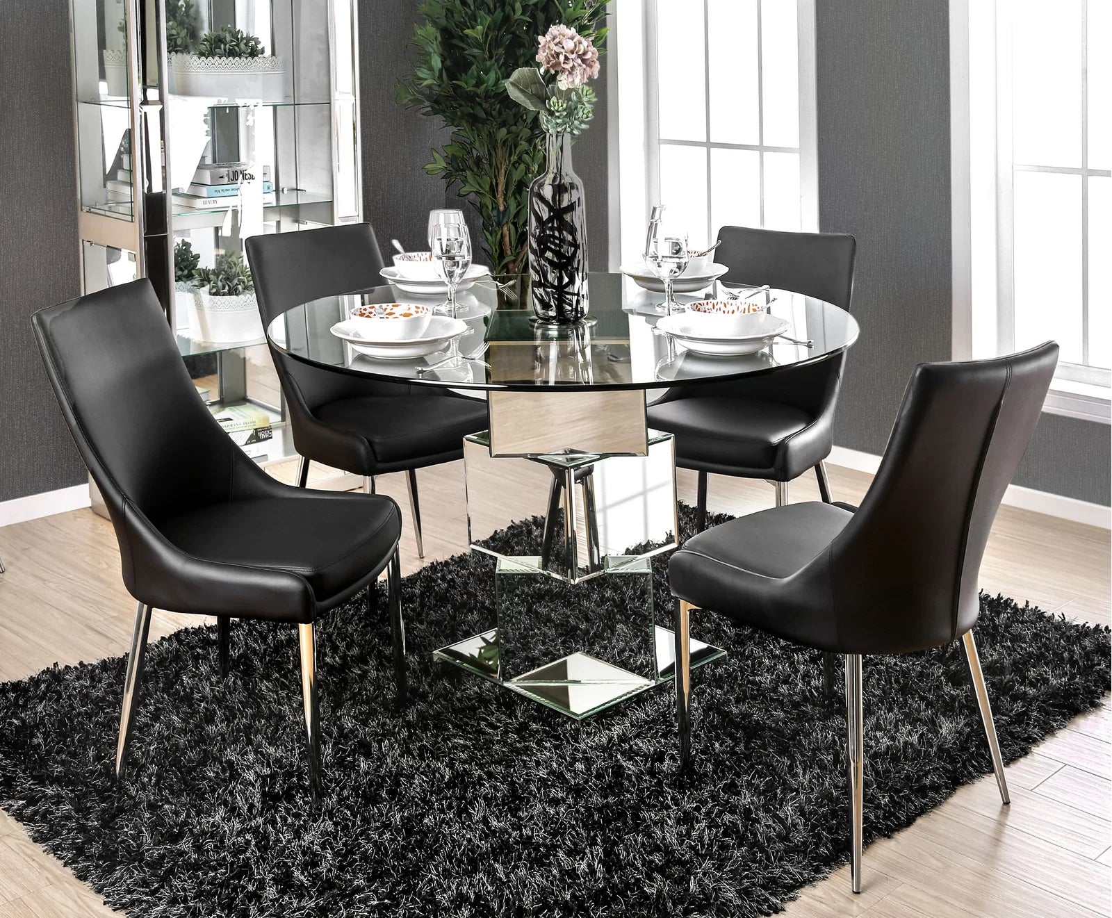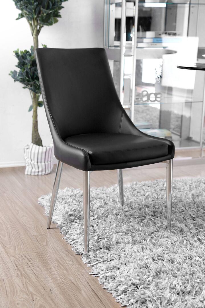 Rediscover sophistication with this simplistically sleek dining set. Glass pieces cover the dining table and welcome light for a clean, brightened aesthetic. Chrome brushed accents shine along the tempered glass top and completes the base for a polished look. Sleek leatherette chairs are comfortably cushioned while peg style legs add character and flare. Gather round and welcome new memories with this dashing dining set.