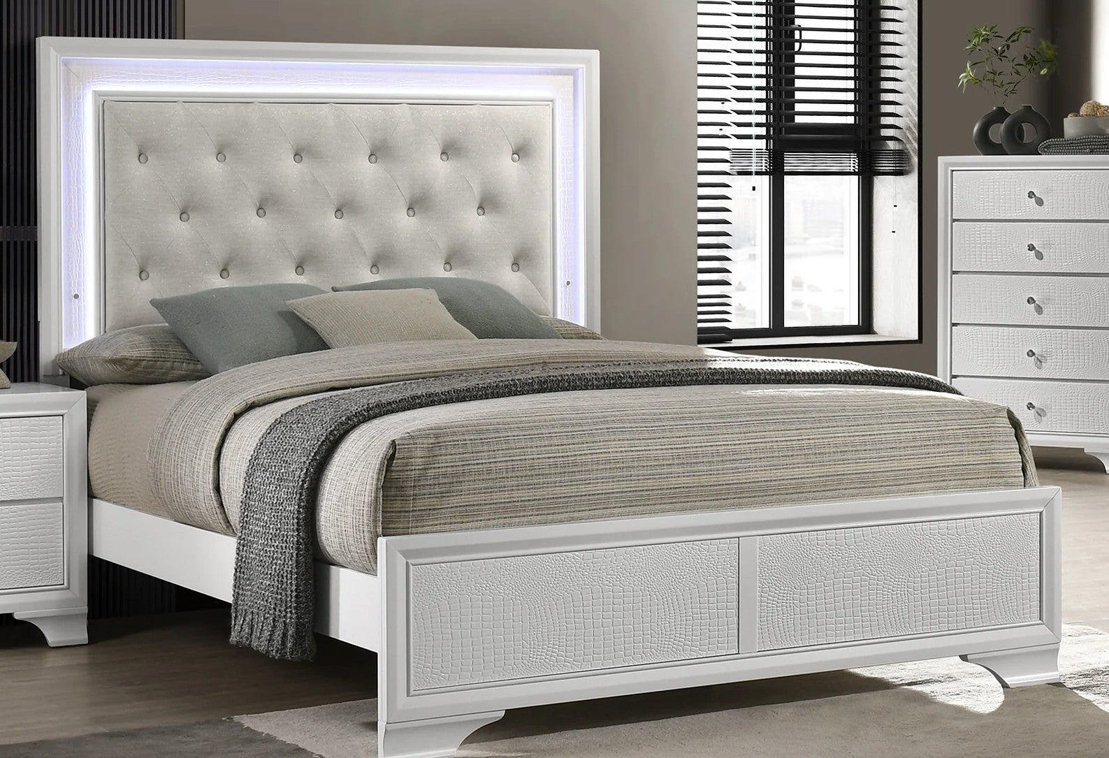 Dive into Distinguished Sophistication, Experience luxury with the Lyssa Collection. The LED backlit headboard, adorned in silk-look vinyl with button tufting, combines elegance with durability. A modern champagne faux or white finish, accentuated by an embossed crocodile pattern, defines contemporary grace. Meticulous craftsmanship is evident with French and English dovetail drawers, metal glides, felt-lined tops for delicate treasures, and dustproof bottoms for added strength.