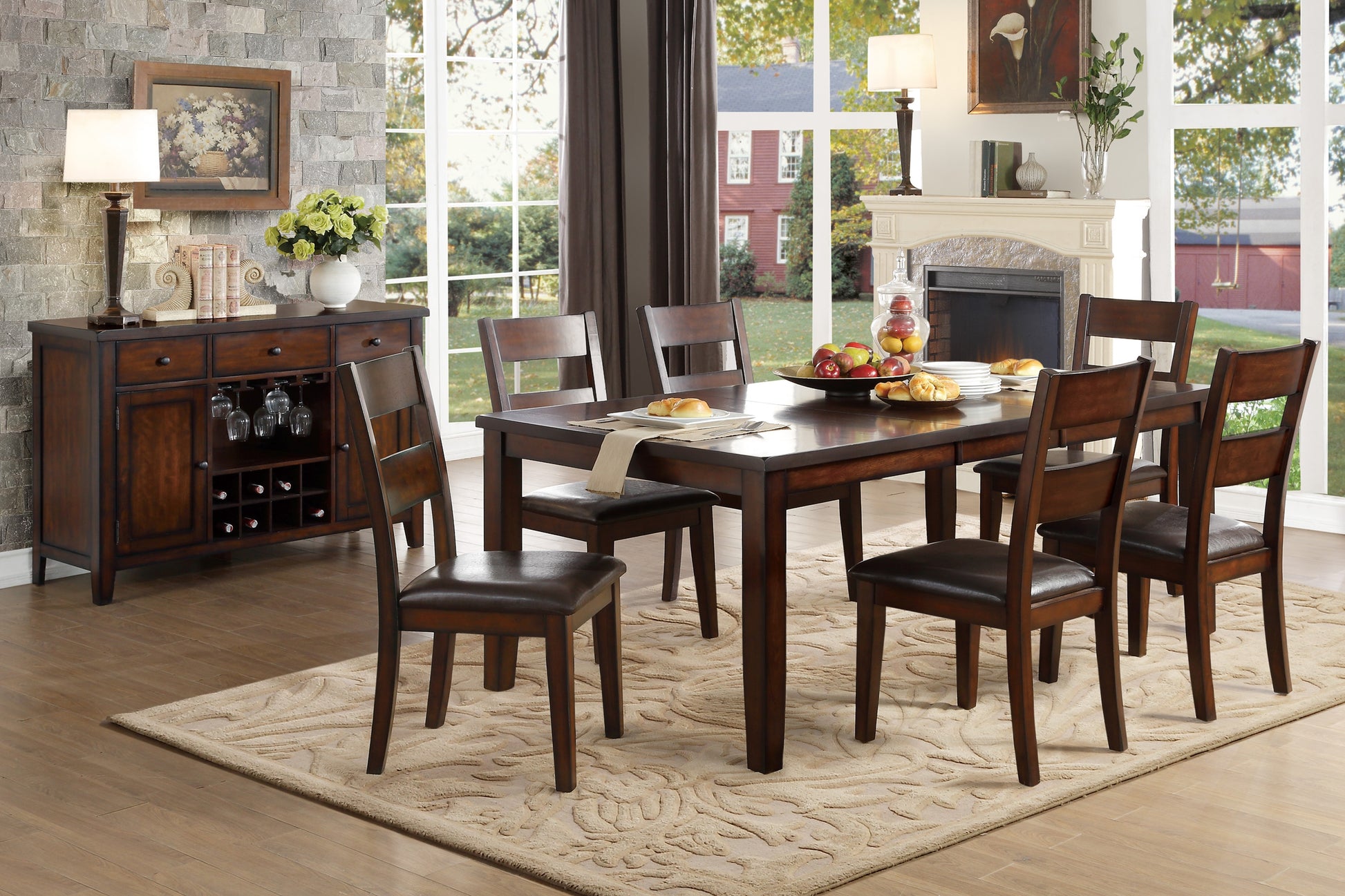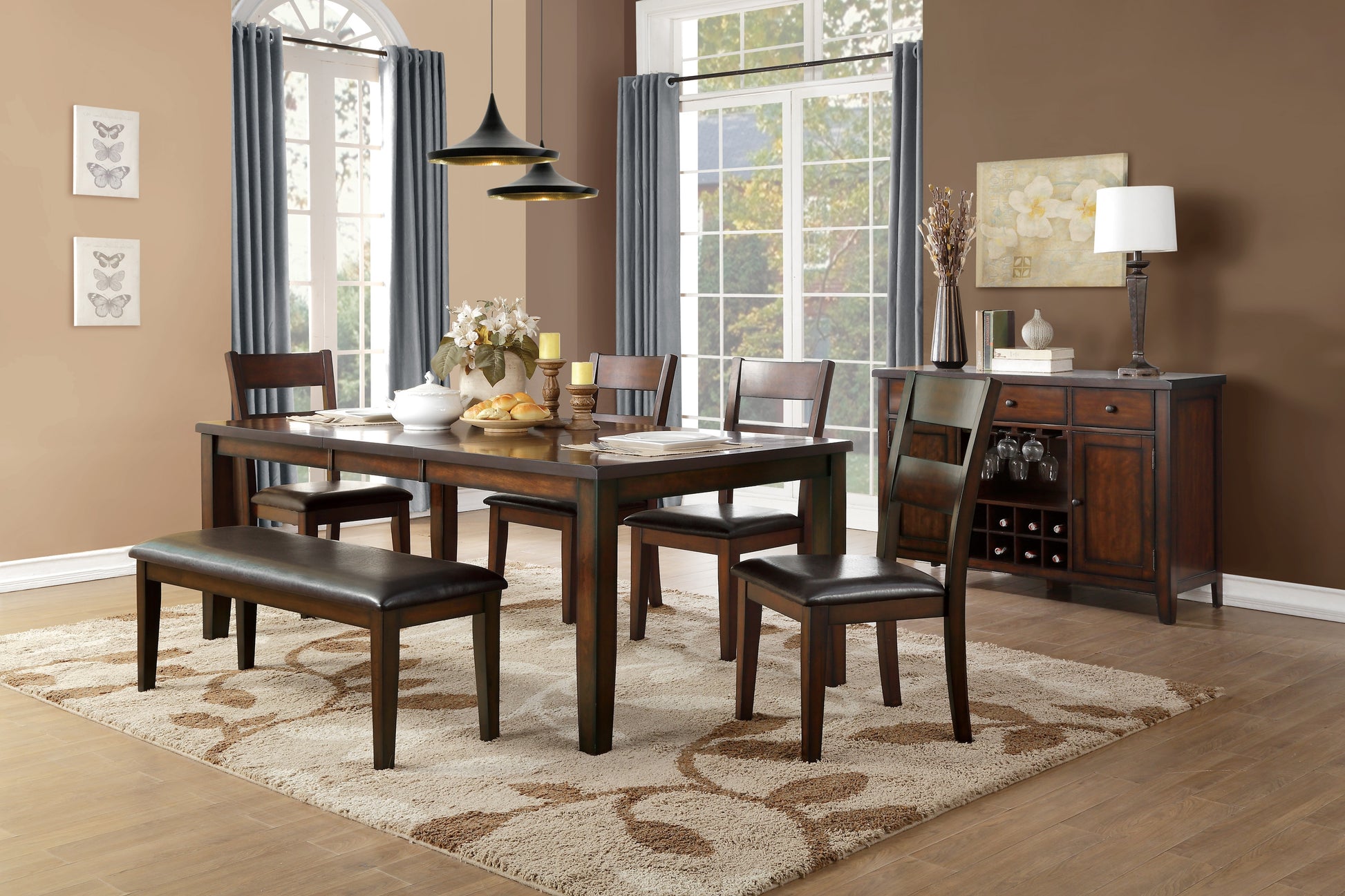 Transitionally styled for your home is the Mantello Collection. Offered in traditional dining height and counter height options, the collection’s cherry finish over mango veneer and classic styling will provide the perfect platform for your mealtime gatherings. Dark brown faux leather covers the available side chairs and wood-backed seat bench for the counter height table – with the selection of seating being configurable to your specific wants and needs. The available server provides functional storage for your tabletop accessories as well as wine bottle rack and glass display.