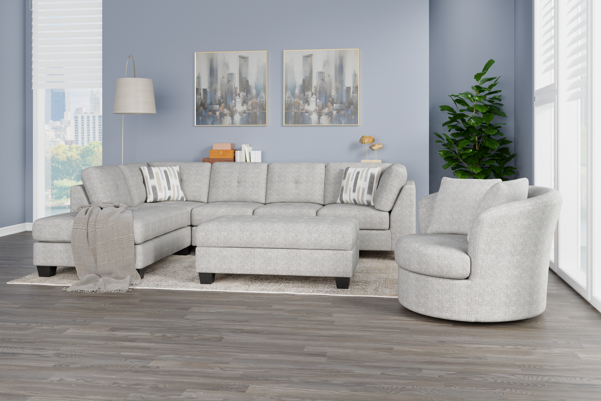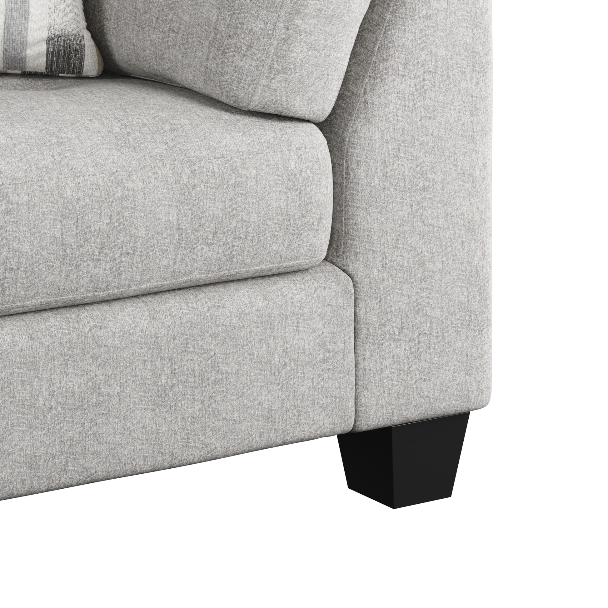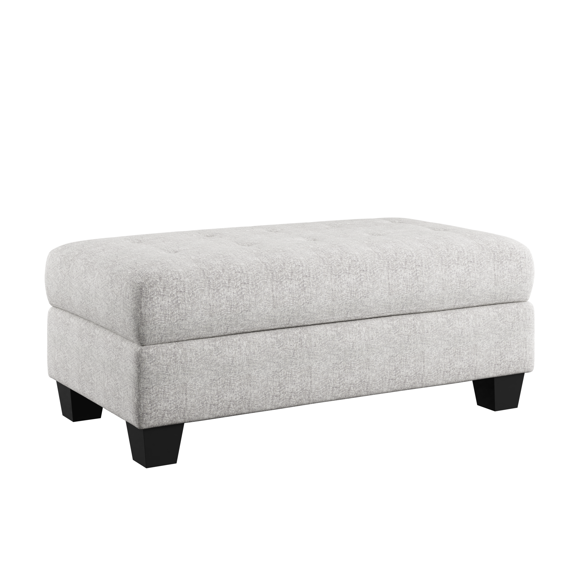 The Myles collection brings a sense of relaxed sophistication to your space. The chaise sectional, featuring contemporary tufting on both cushions and frame and sturdy solid wood legs, strikes a balance between modern design and lasting comfort. A storage cocktail ottoman keeps essentials close at hand yet out of sight. A roomy swivel chair invites you to sink in and unwind, offering a cozy spot to relax or enjoy conversation. Upholstered in light gray chenille with a faint patterned texture, the Myles collection is designed for spaces where style meets everyday living.