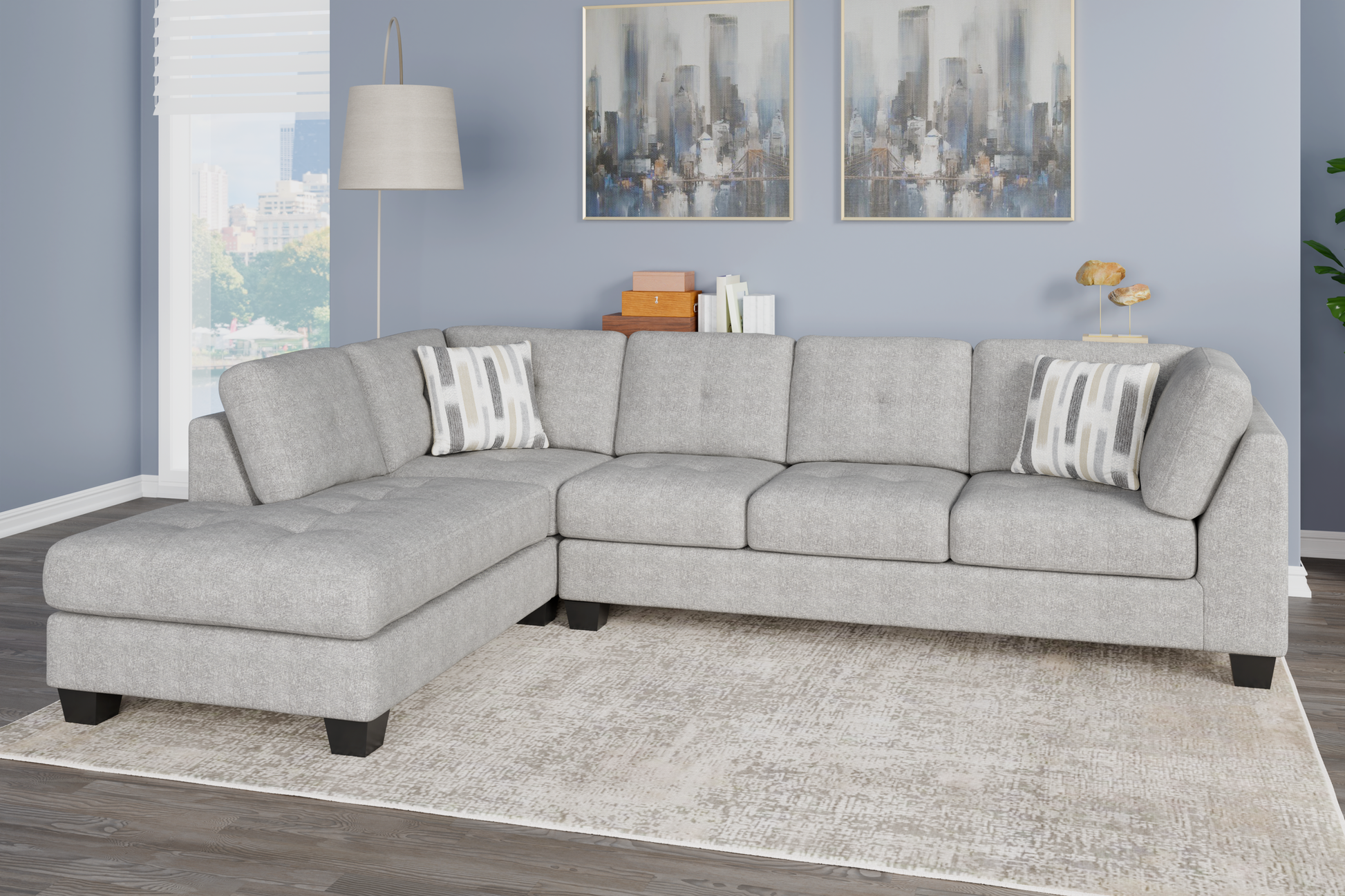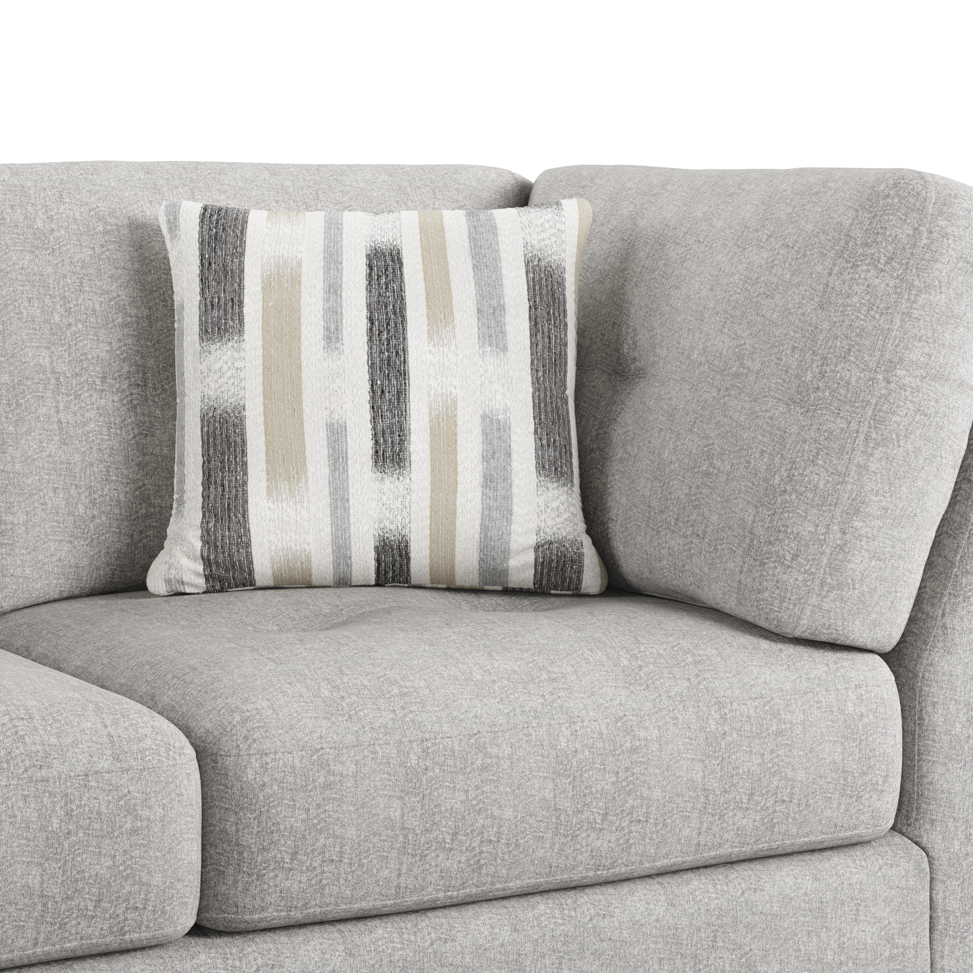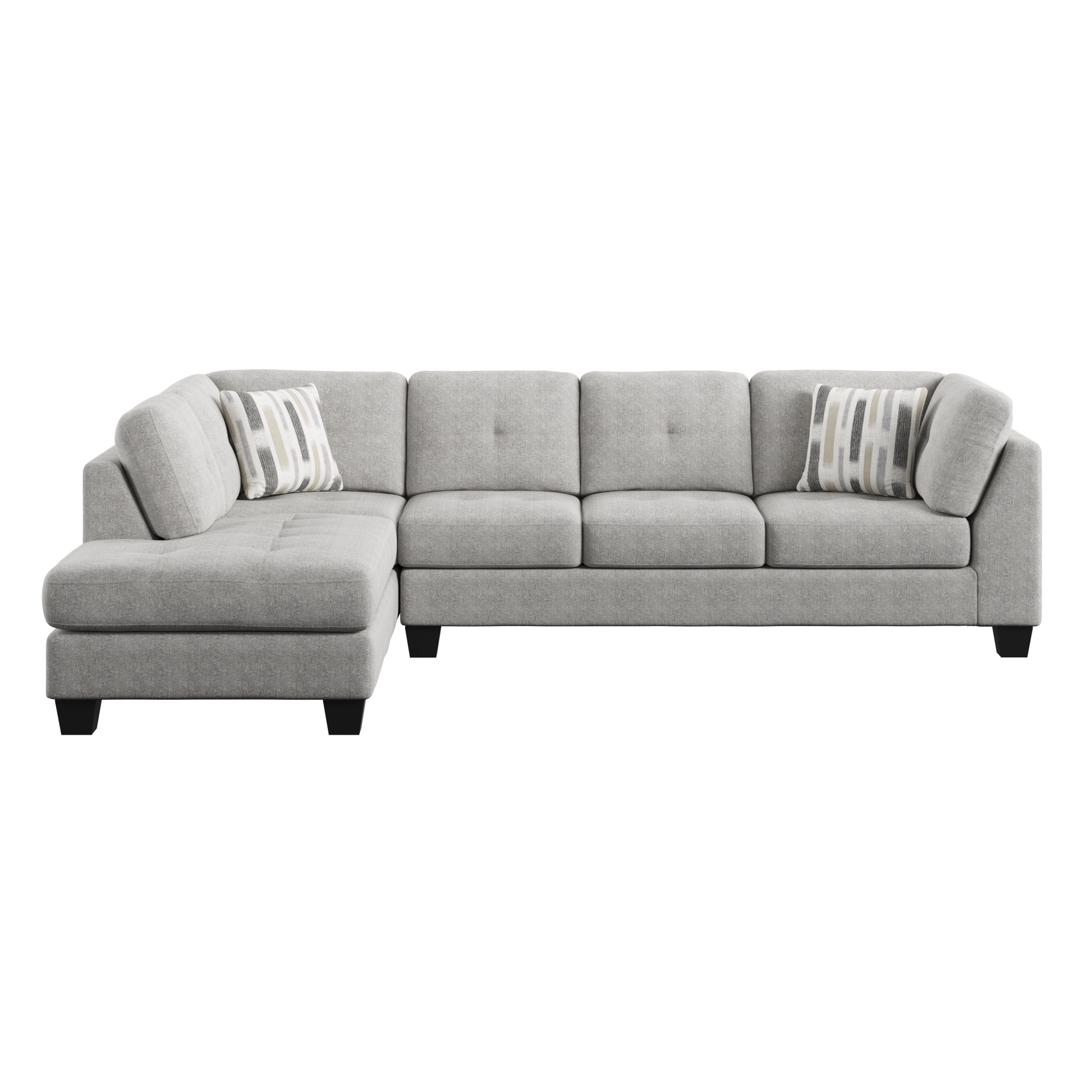 The Myles collection brings a sense of relaxed sophistication to your space. The chaise sectional, featuring contemporary tufting on both cushions and frame and sturdy solid wood legs, strikes a balance between modern design and lasting comfort. A storage cocktail ottoman keeps essentials close at hand yet out of sight. A roomy swivel chair invites you to sink in and unwind, offering a cozy spot to relax or enjoy conversation. Upholstered in light gray chenille with a faint patterned texture, the Myles collection is designed for spaces where style meets everyday living.