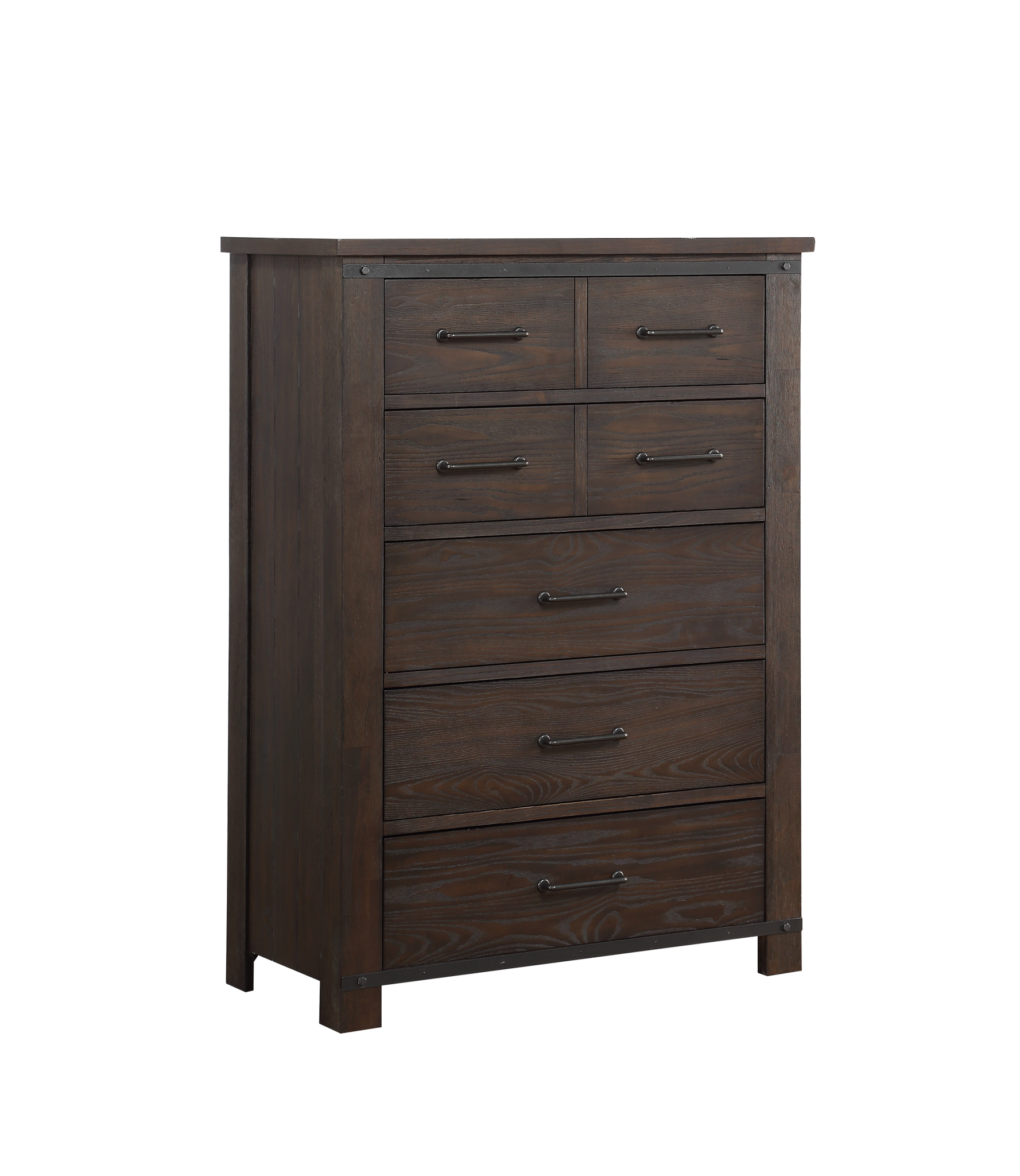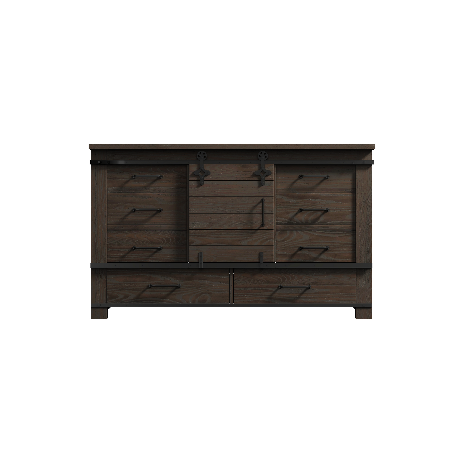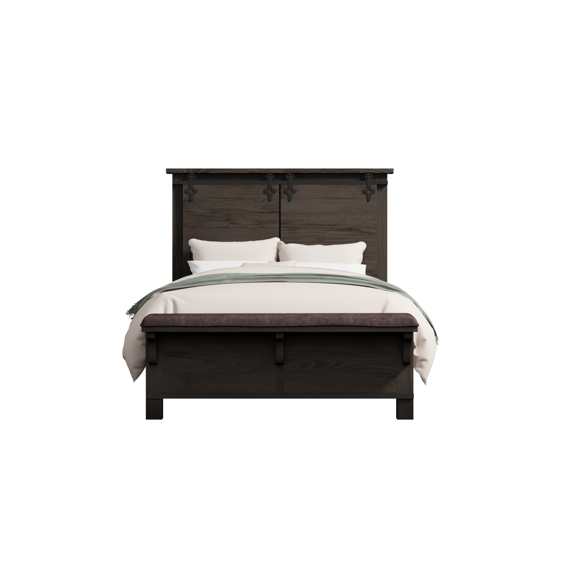 Farmhouse styling is enhanced with the Newton bedroom collection. Barndoor slides and metal accents are eye-catching features of this solid hardwood collection. A distressed finish in a deep cocoa brown completes the rustic look—perfect for transforming your master suite!