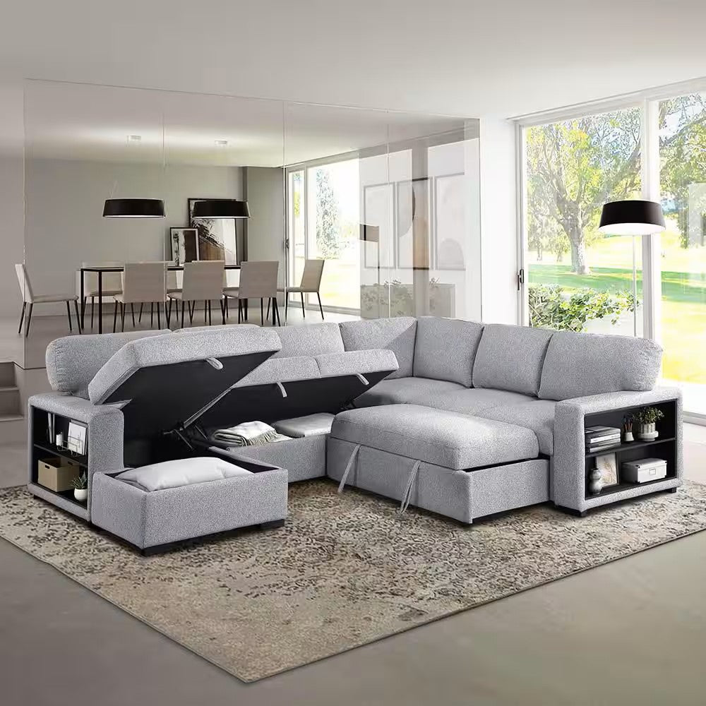 Maximize both style and functionality with this modern sectional sofa, designed for ultimate comfort, smart storage solutions, and contemporary elegance. Featuring a right-facing chaise lounge, a pull-out sleeper bed, and multiple hidden storage compartments, this sectional is perfect for lounging, entertaining, and optimizing living spaces. The built-in shelves on the armrest provide easy access to books, décor, or essentials, while integrated USB charging ports keep your devices powered without the clutter of extra cords. Upholstered in soft, durable fabric, this multi-functional sectional seamlessly blends style, practicality, and everyday convenience, making it an ideal centerpiece for any living room or entertainment space.