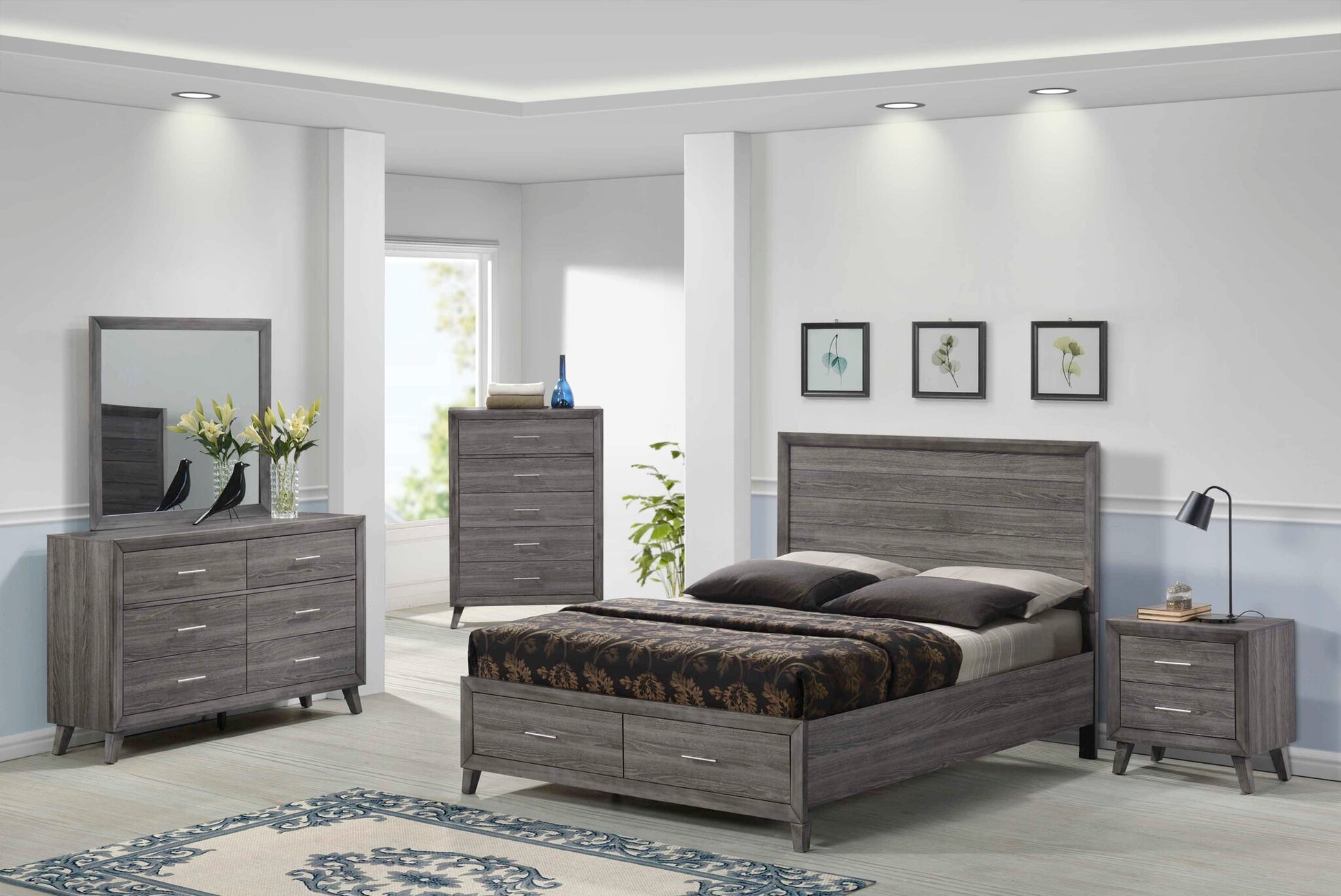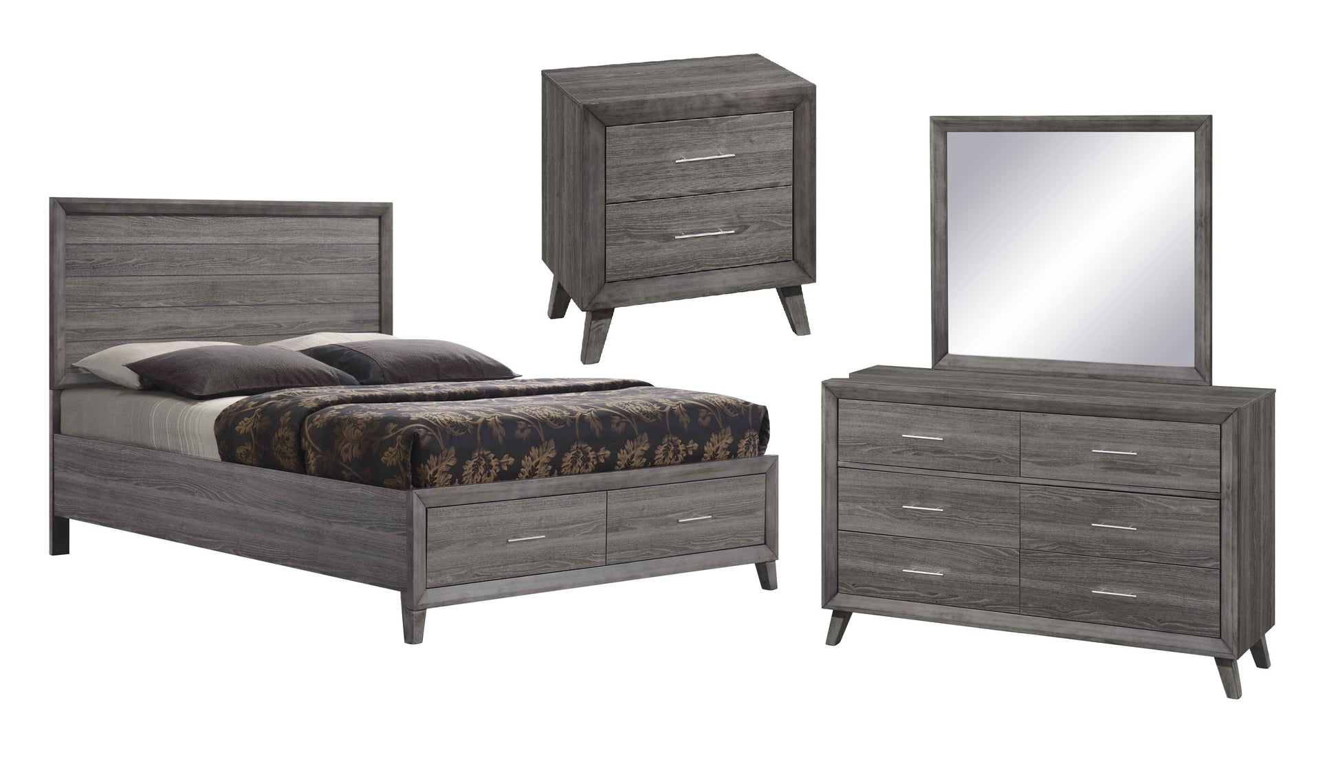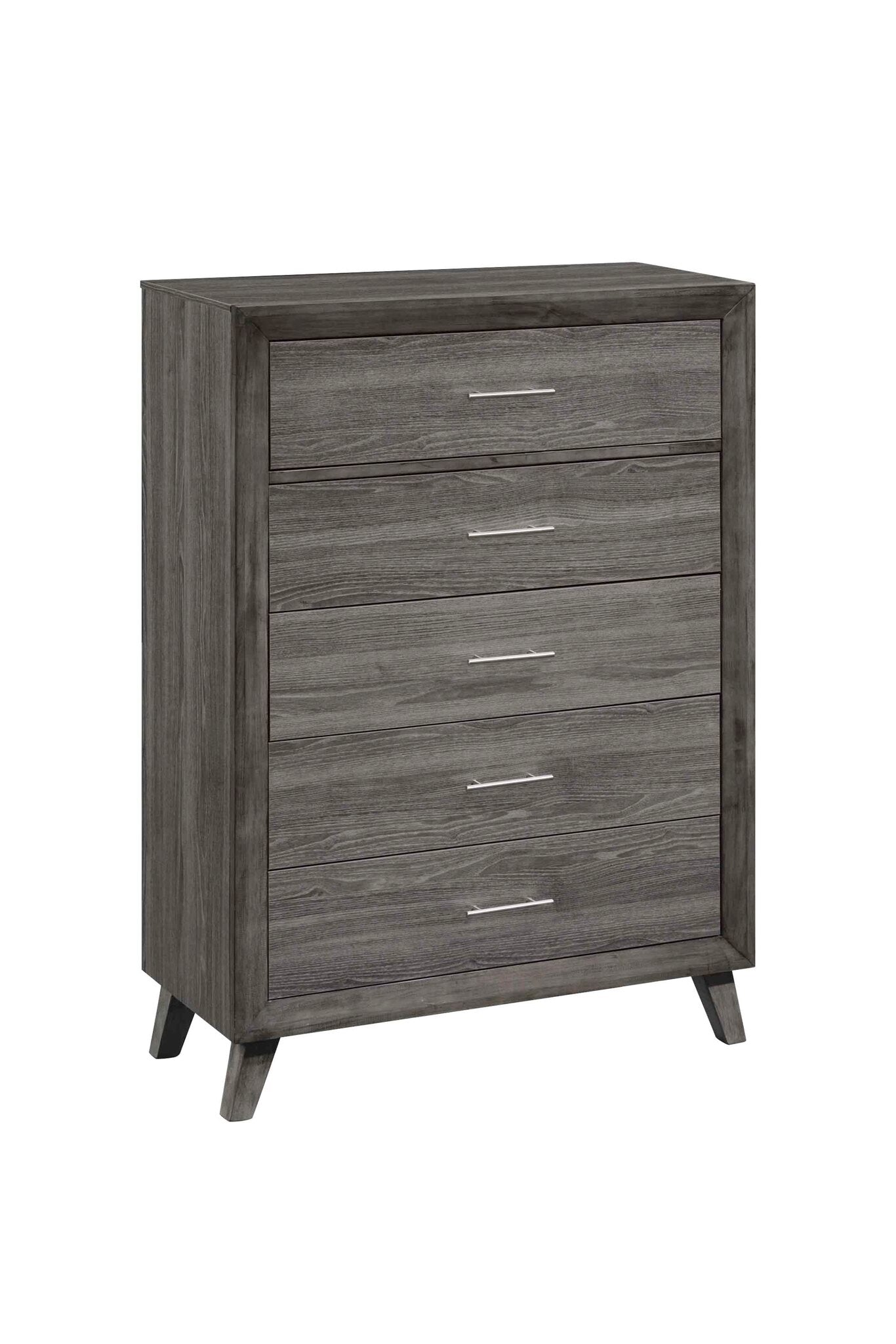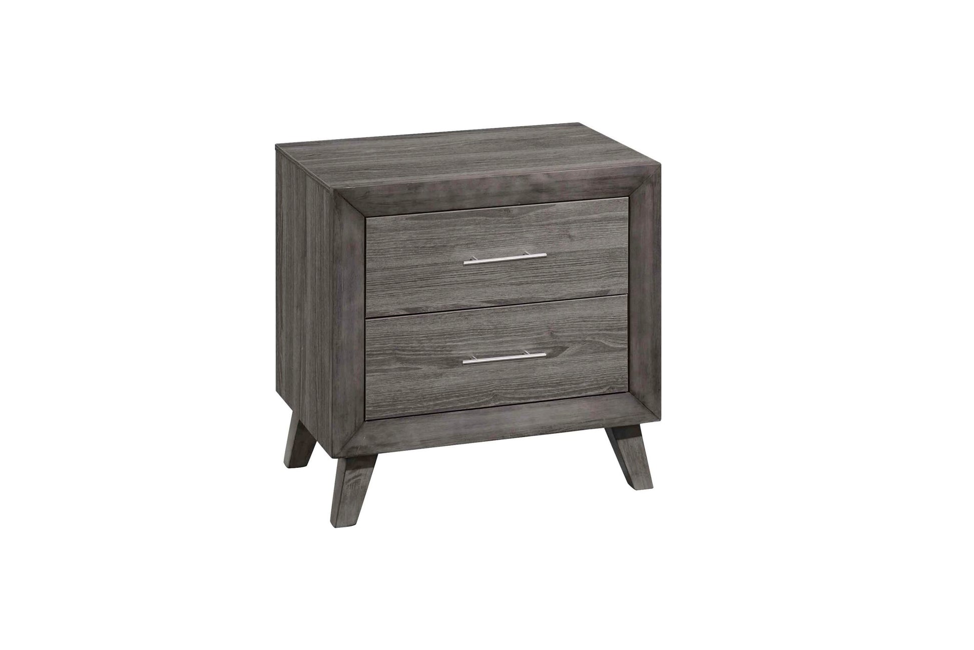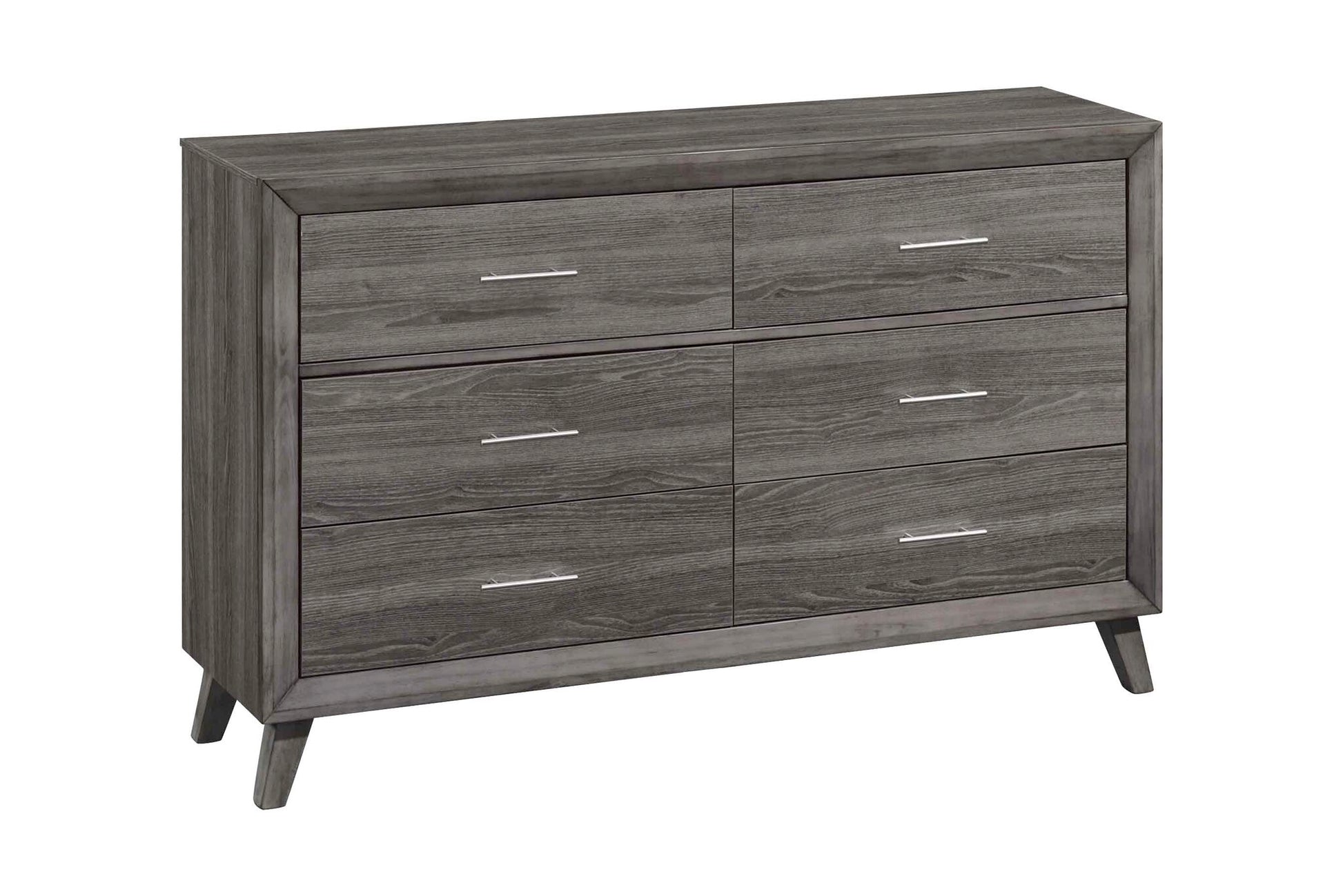 Contemporary minimalism at it’s best, the Rappa bedroom is crafted from hardwood solids with scratch resistant melamine for easy care. Well-defined shapes cut a crisp silhouette underscored by angled A-line legs. Silver-toned bar drawer pulls shine against the warm gray tones for understated chic.