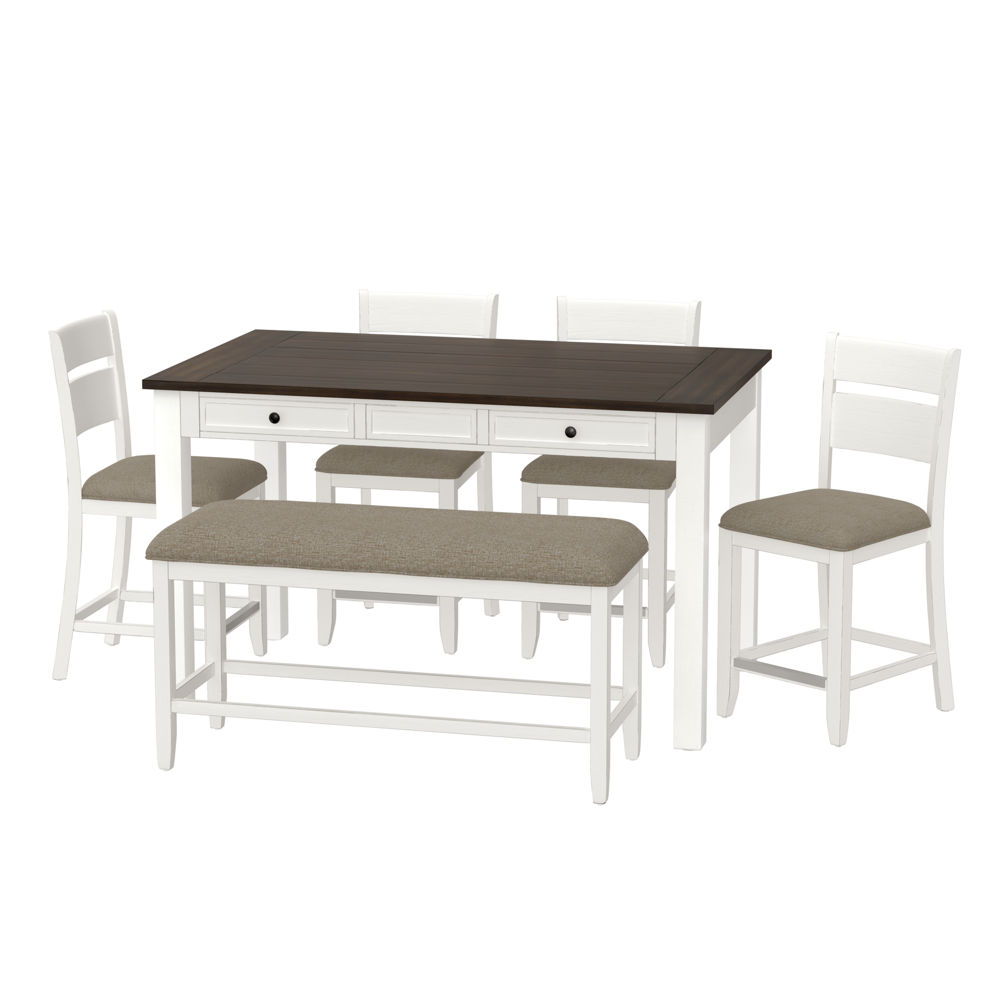 The casual Sarasota dining collection combines style with functional ease. A medium brown plank-style top caps a deeply aproned table base in dark brown for an attractive two-tone finish. Four felt-lined drawers offer convenient storage for napkins and placemats, utensils and trivets, or for tucking away work when it’s time to eat. This gathering height table comes with four stools and a bench, all with seating upholstered in a brown, soft chenille for informal appeal.