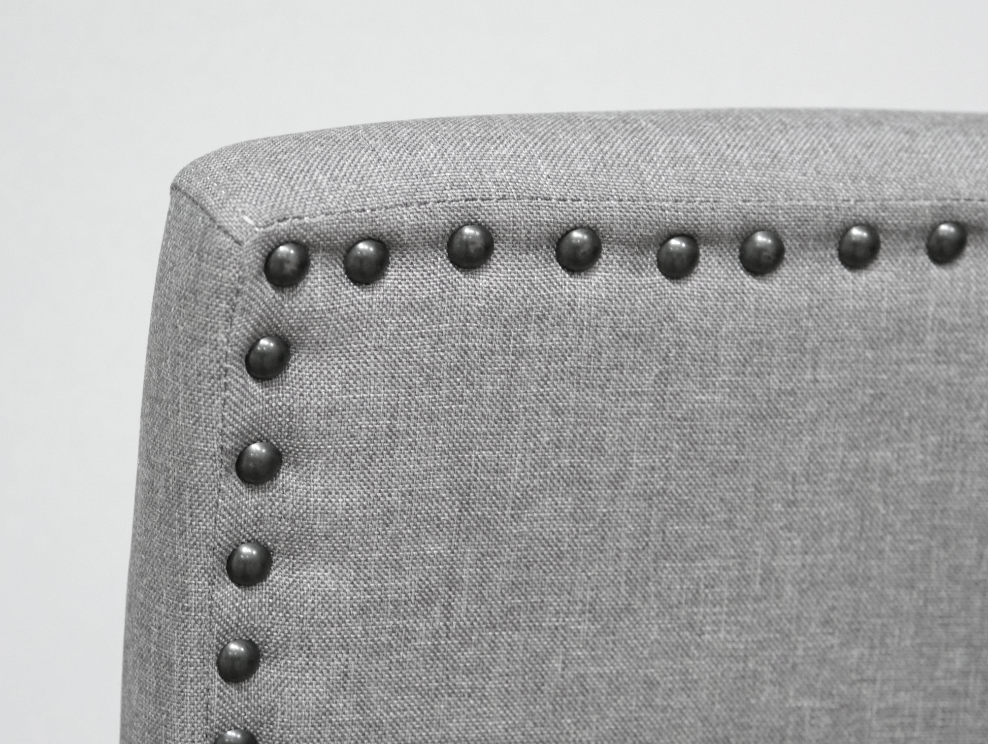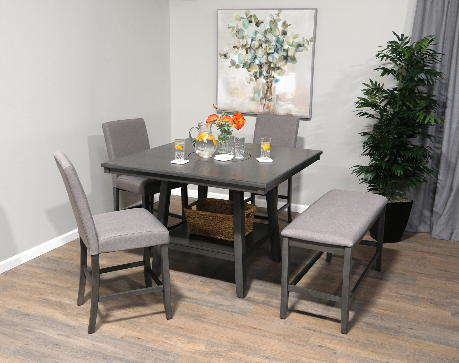 The transitional Seneca collection hosts a unique blend of features and seating options. A delightful rich brown finish on walnut veneers forms a quarter-turned pattern on the tabletop, culminating in the built-in 18” lazy Susan. The tapered frame spreads out to encompass a lower shelf for extra storage. Seating with light tan upholstery and gently curved backs decorated with nailhead trim, you can stay more traditional with just stools or more casual by mixing in a bench or two. Accentuate your personal style and give the Seneca a whirl.