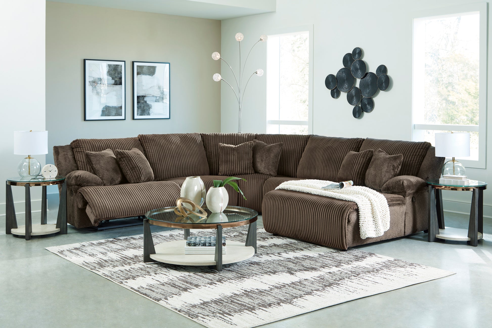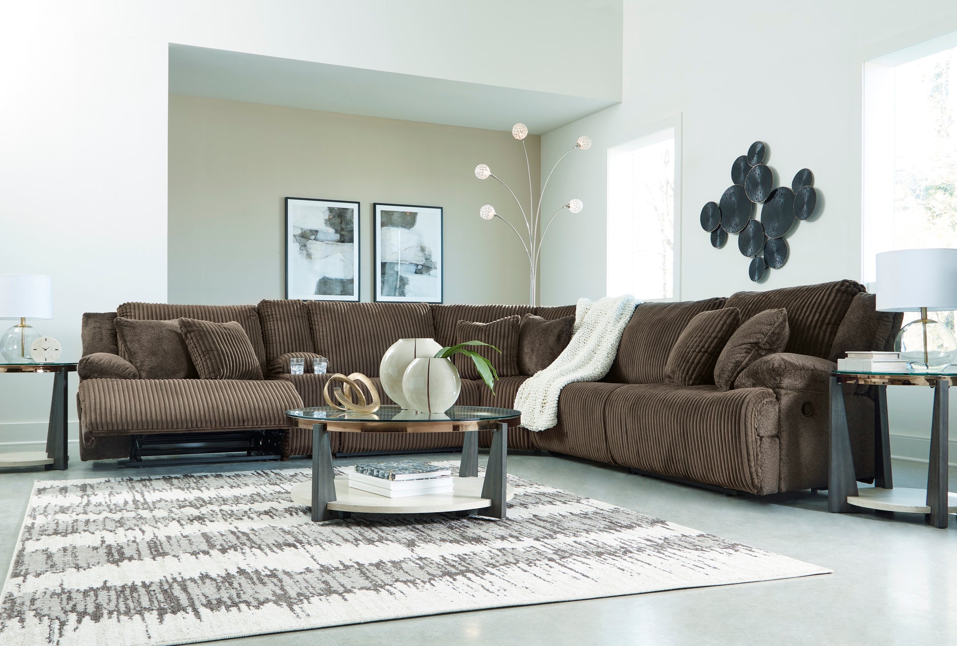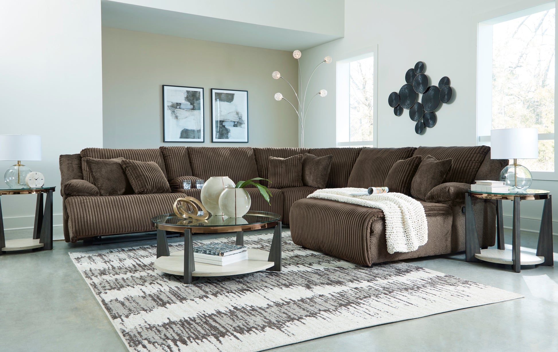 Experience unparalleled comfort with this reclining sectional. It’s a stylish and invitingly soft look—made all the more appealing by cozy corduroy cushions that feel great and add a touch of texture. The rich chocolate brown upholstery effortlessly blends into your decor, making it a gorgeous addition to your home. So sit back and unwind in this spacious set, perfect for gatherings with friends and family.