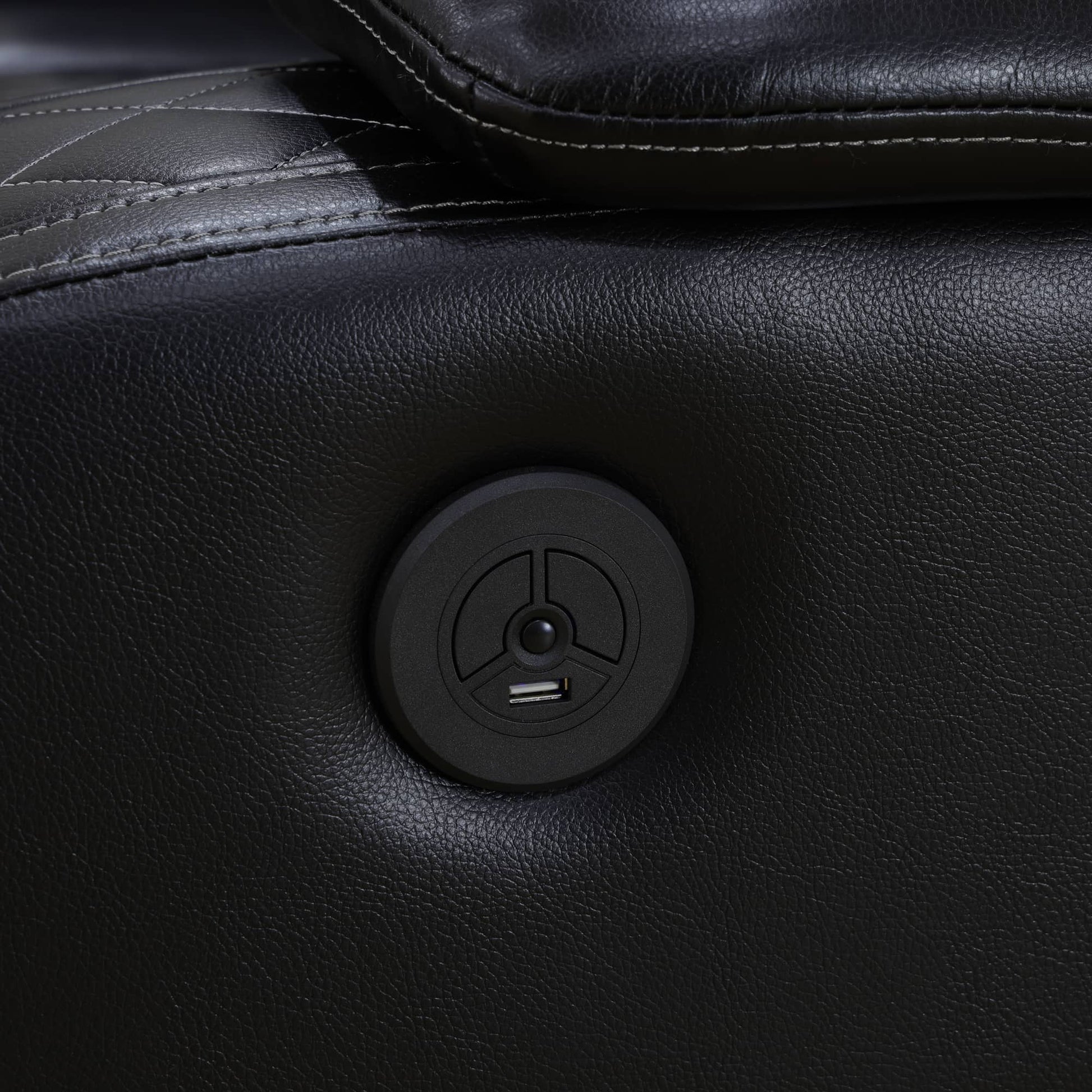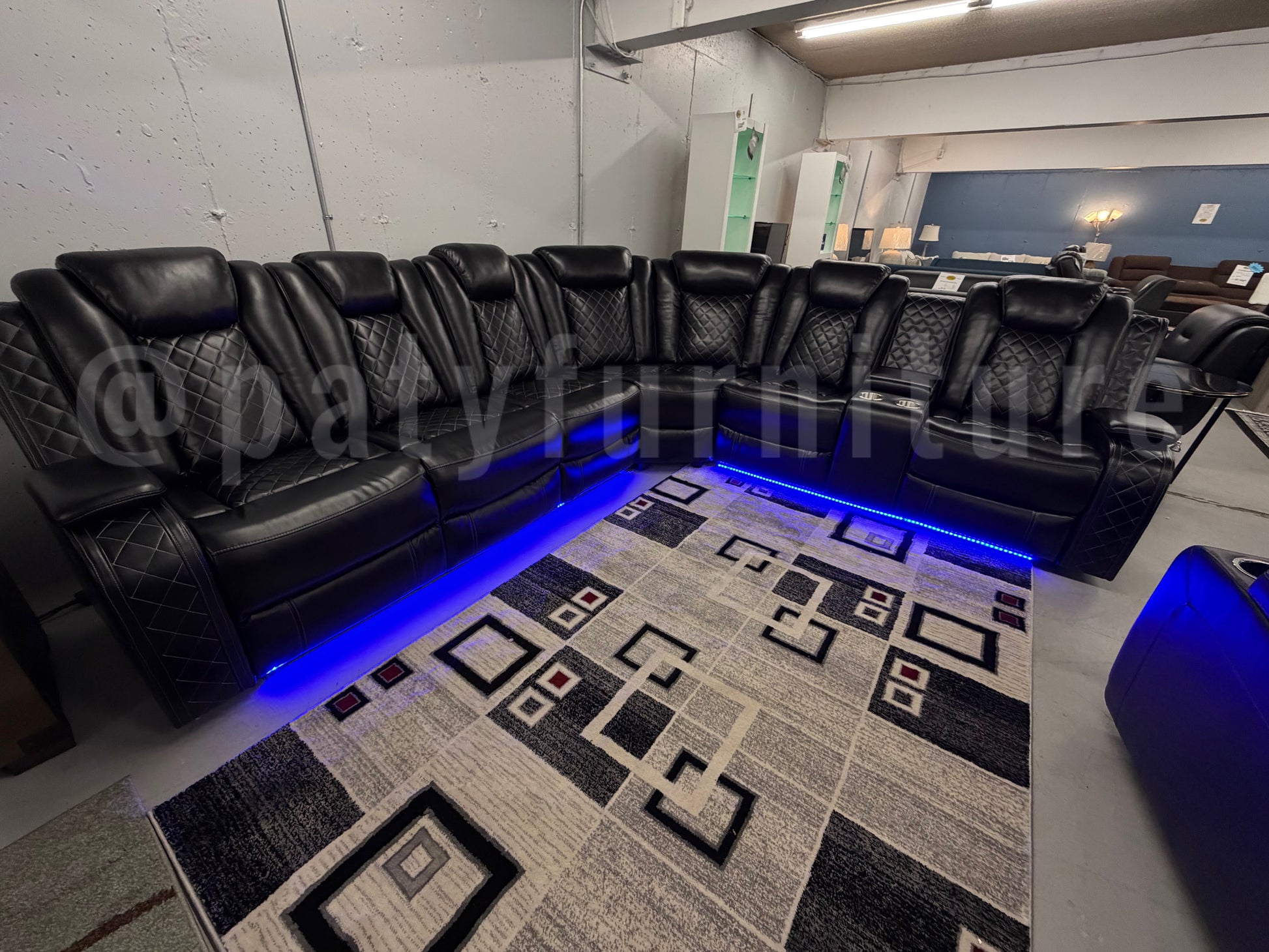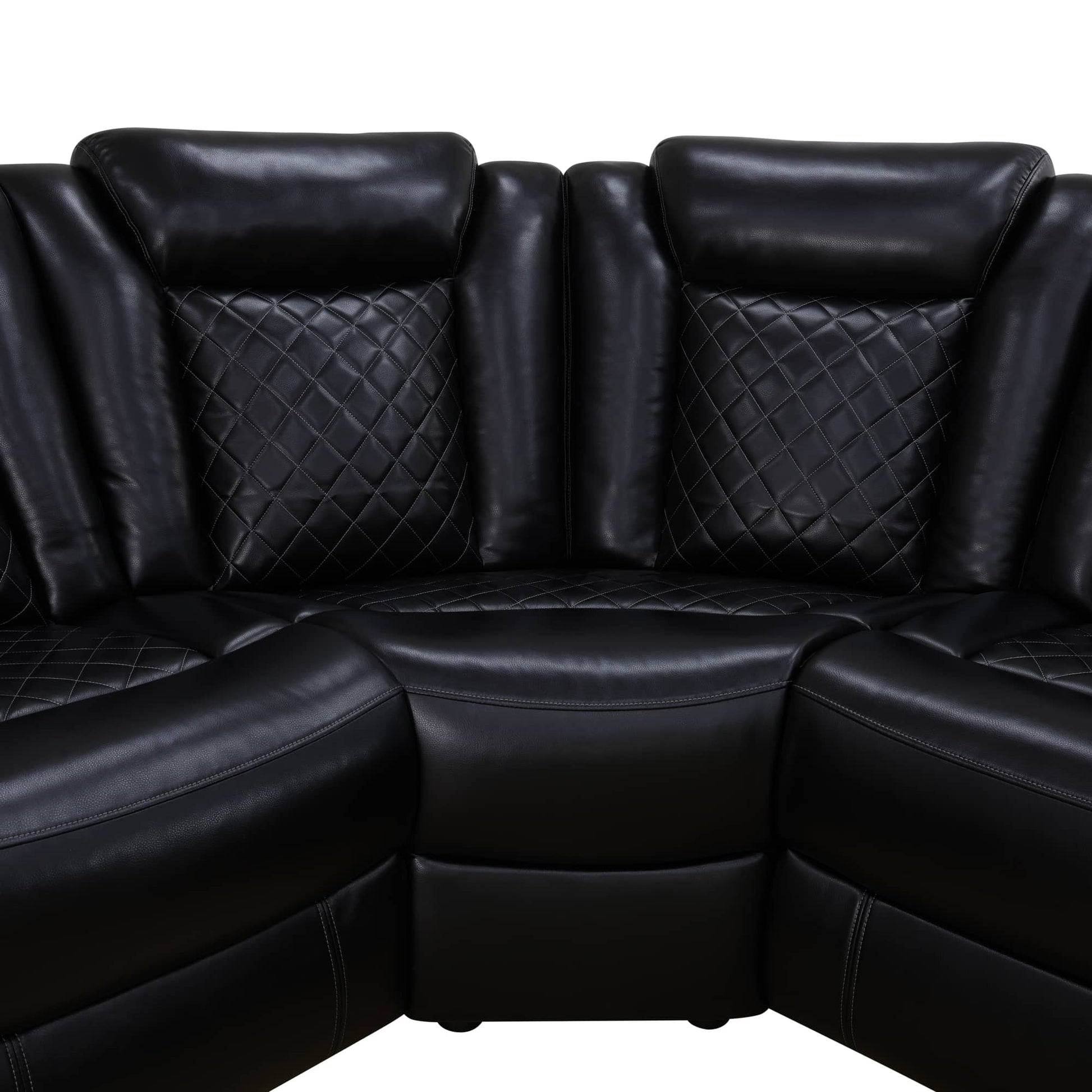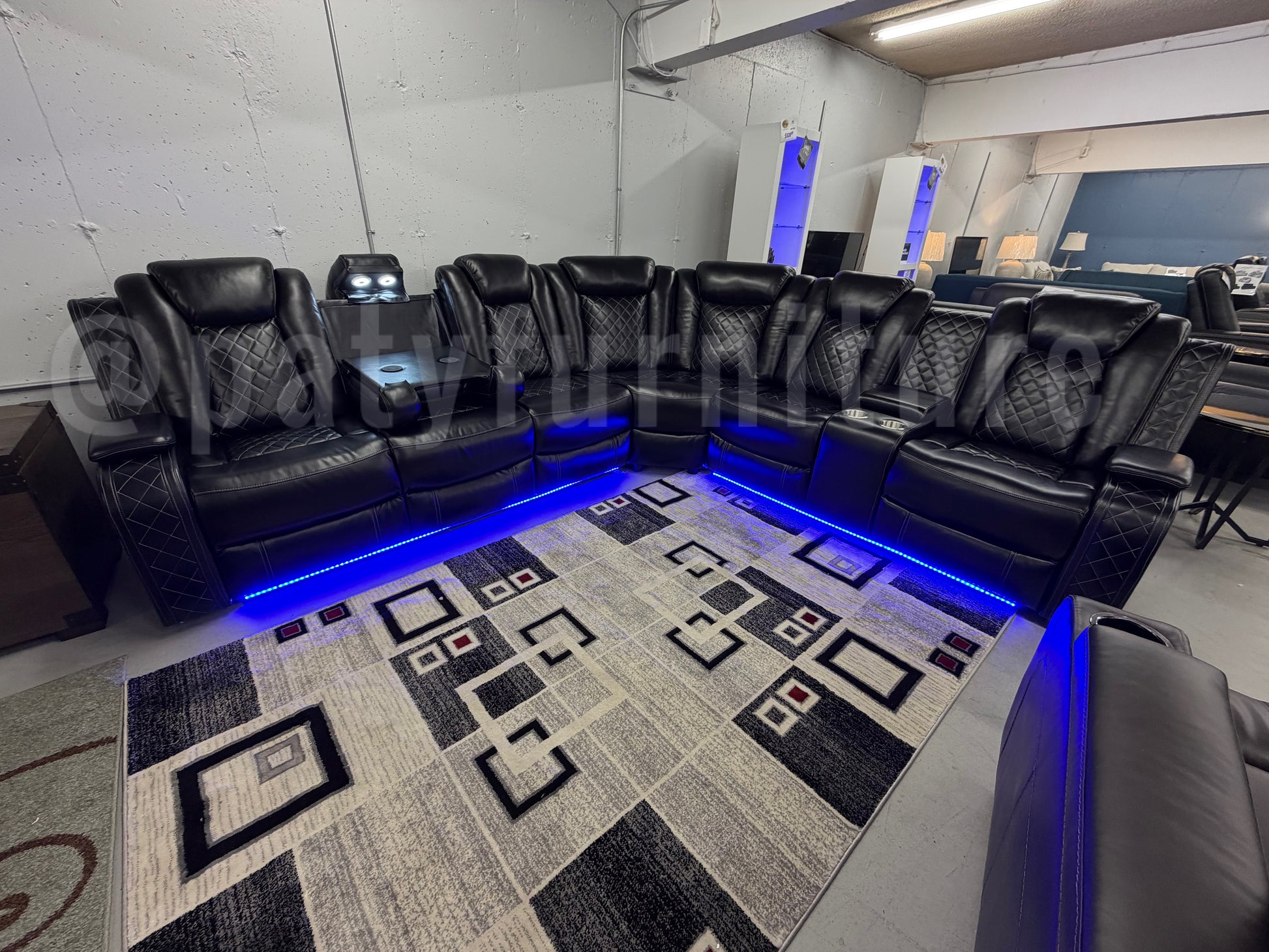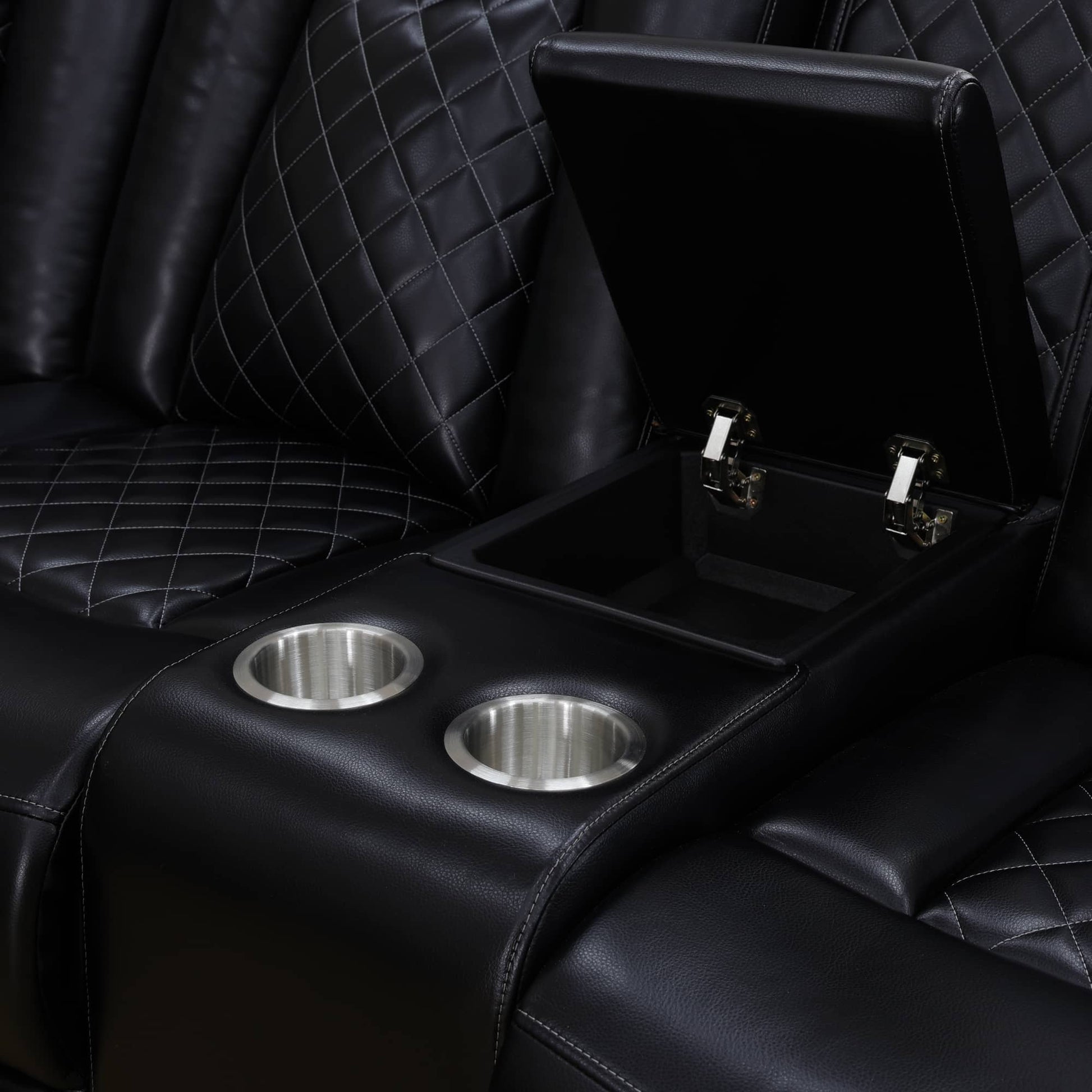 The Nova Collection power reclining sectional features sleek black faux leather with diamond-stitched detailing, two power reclining seats, USB charging ports on each armrest, a center console with cup holders and storage, wireless phone charging, and blue LED accent lighting for a modern, theater-style look. A matching recliner chair is available separately.