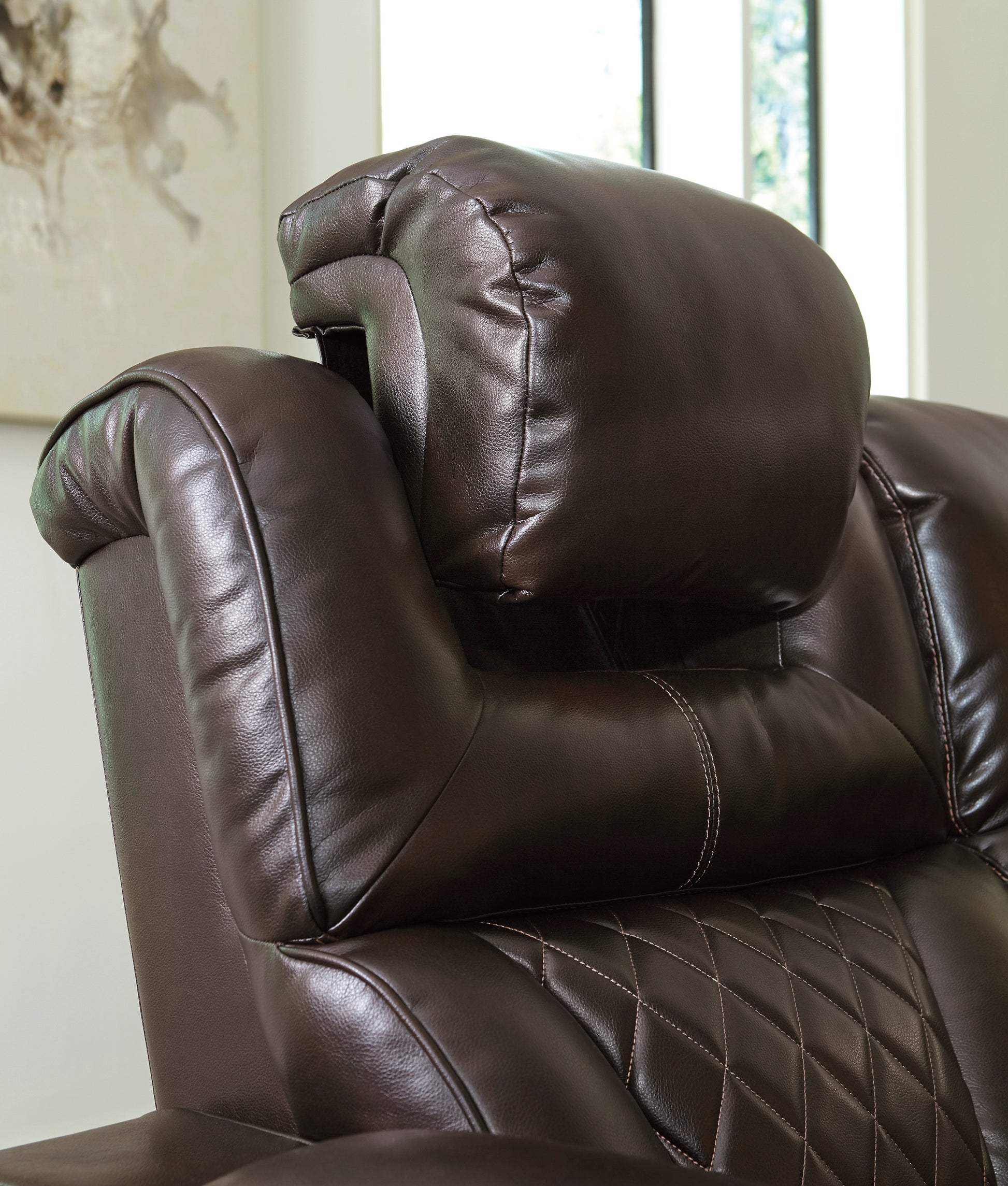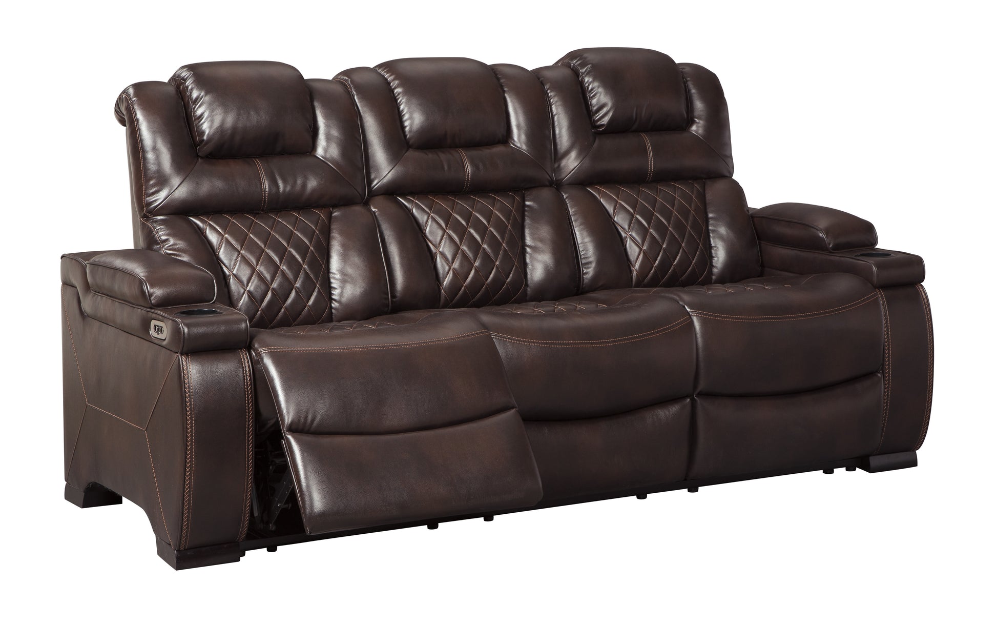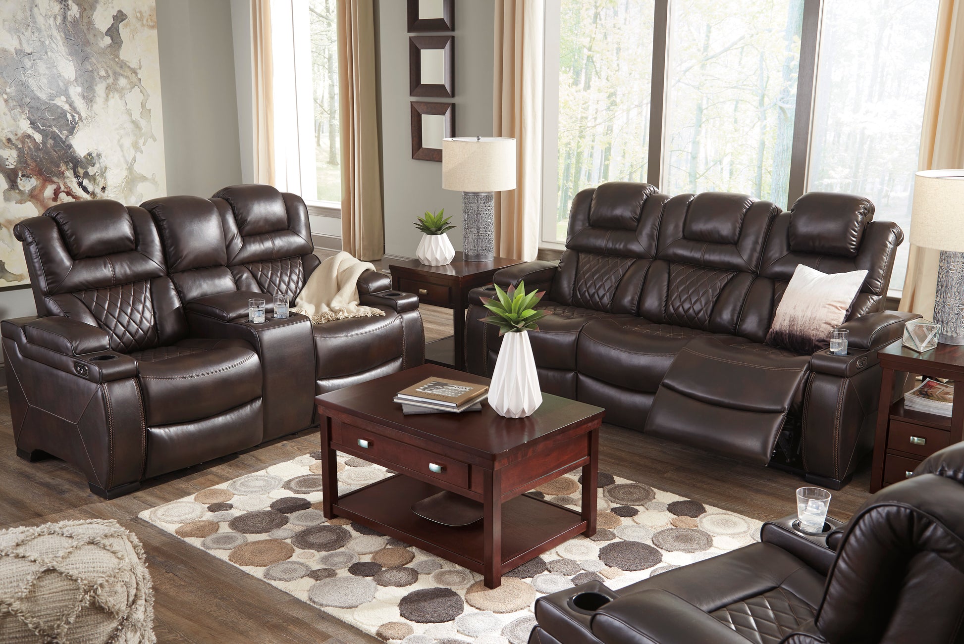 Your modern living room awaits with this power reclining set. Complete with practical faux leather upholstery beautified with diamond lattice stitching one-touch power controls, adjustable headrests and USB ports, it makes finding the best seat in the house a breeze. Go ahead—treat yourself to a high-design home theater experience, priced to put you at ease.