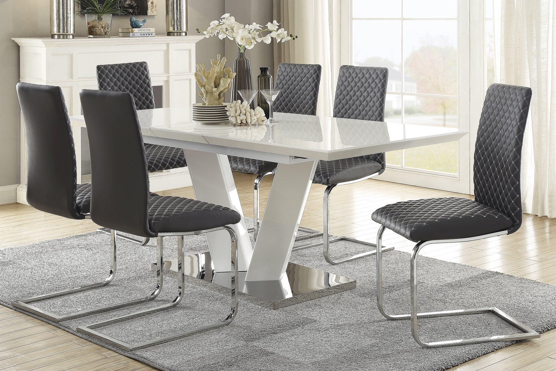Sleek contemporary styling provides the platform from which you will create your casual dining space in the Yannis Collection. Ultra-bright high gloss finish of the tabletop and V-shaped support provides a distinct contrast to the high polish chrome base plate. The continuous base of the accenting chairs rises to support gray faux leather seats with diamond pattern stitching providing additional visual interest. A smooth glide system opens with ease to reveal the self-storing butterfly leaf.